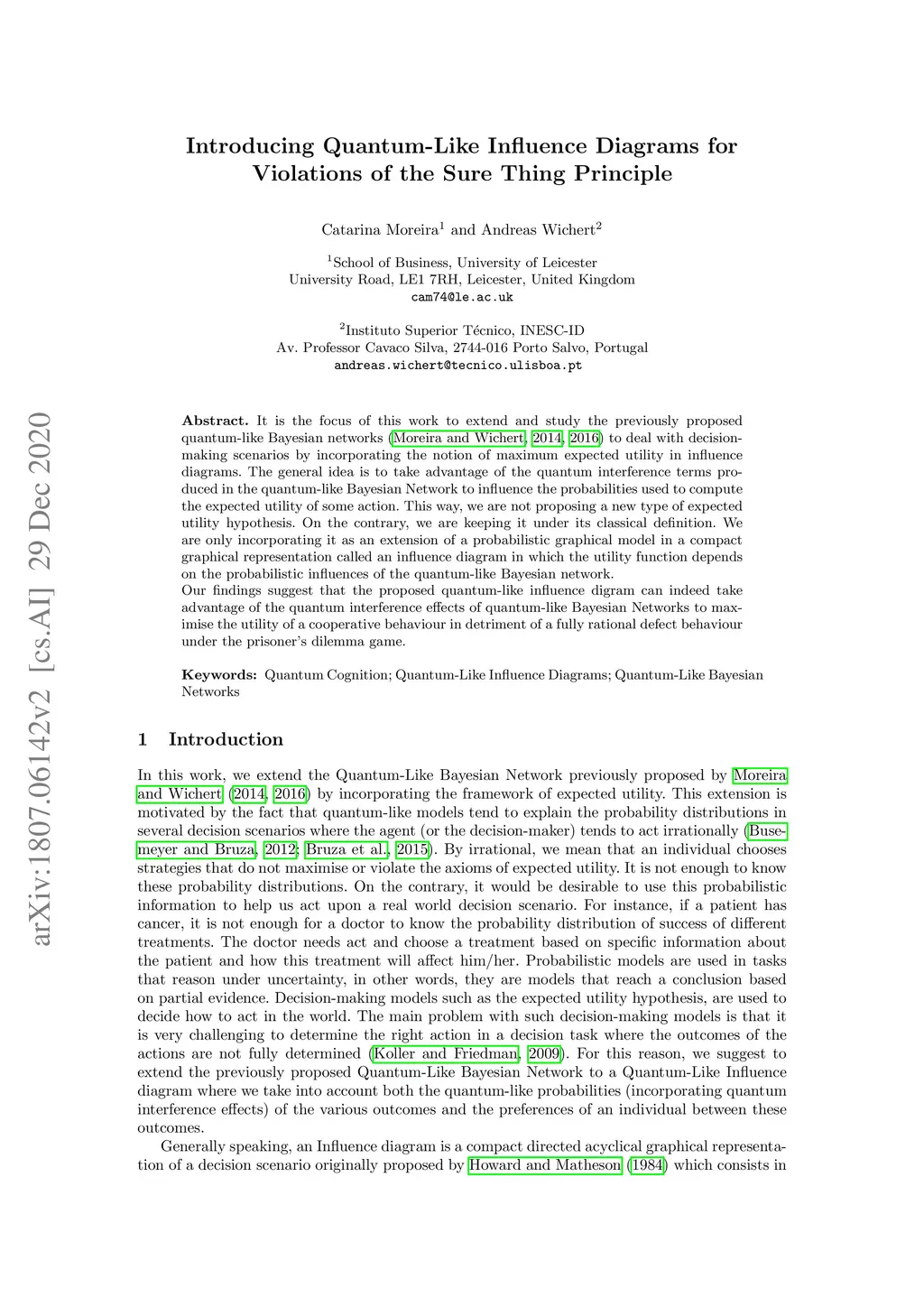 It is the focus of this work to extend and study the previously proposed quantum-like Bayesian networks to deal with decision-making scenarios by incorporating the notion of maximum expected utility in influence diagrams. The general idea is to take advantage of the quantum interference terms produced in the quantum-like Bayesian Network to influence the probabilities used to compute the expected utility of some action. This way, we are not proposing a new type of expected utility hypothesis. On the contrary, we are keeping it under its classical definition. We are only incorporating it as an extension of a probabilistic graphical model in a compact graphical representation called an influence diagram in which the utility function depends on the probabilistic influences of the quantum-like Bayesian network. Our findings suggest that the proposed quantum-like influence digram can indeed take advantage of the quantum interference effects of quantum-like Bayesian Networks to maximise the utility of a cooperative behaviour in detriment of a fully rational defect behaviour under the prisoner's dilemma game.