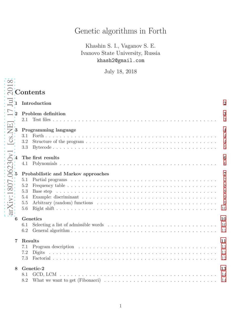 A method for automatically finding a program (bytecode) realizing the given algorithm is developed. The algorithm is specified as a set of tests (input\_data) $ \rightarrow $ (output\_data). Genetic methods made it possible to find the implementation of relatively complex algorithms: sorting, decimal digits, GCD, LCM, factorial, prime divisors, binomial coefficients, and others. The algorithms are implemented on a highly simplified version of Forth language.