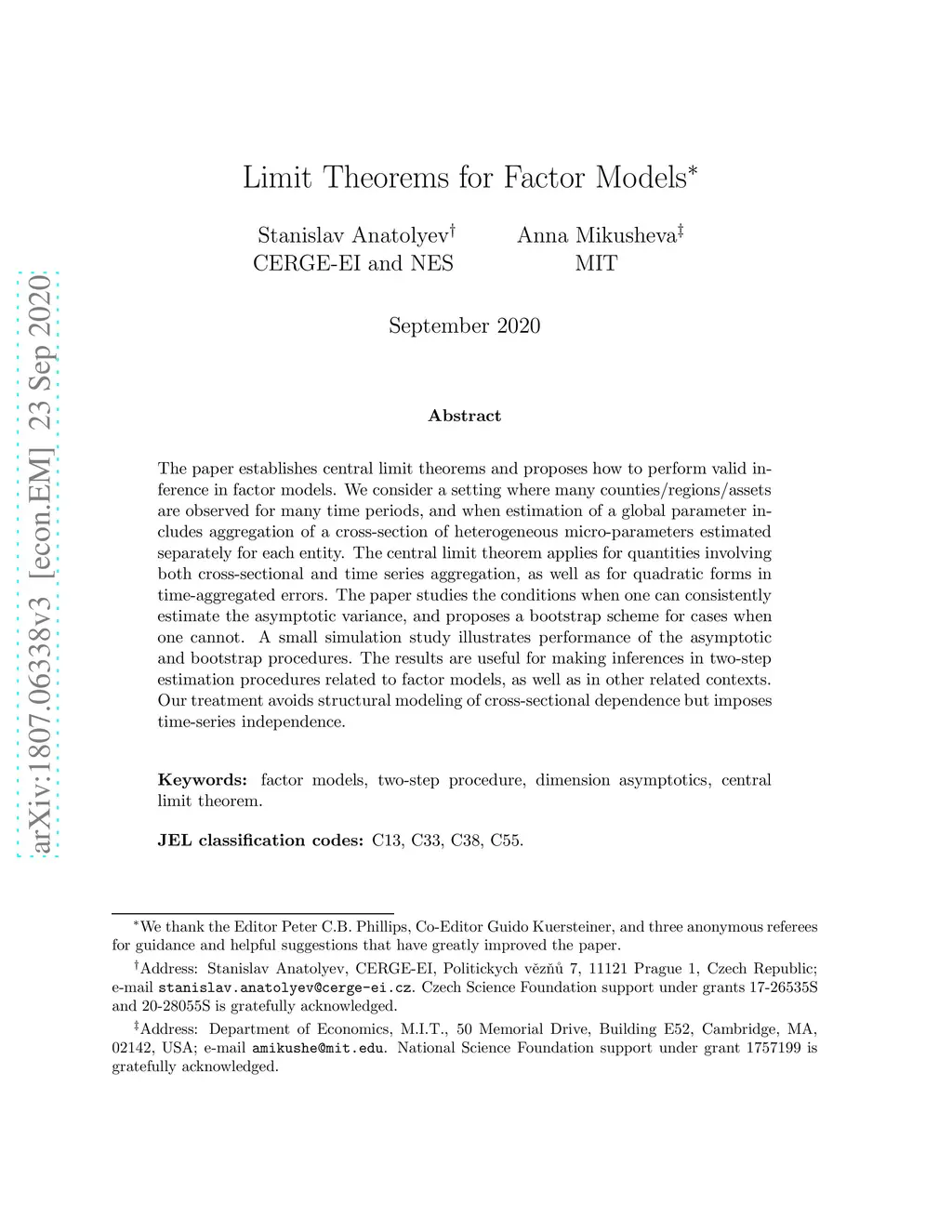 The paper establishes the central limit theorems and proposes how to perform valid inference in factor models. We consider a setting where many counties/regions/assets are observed for many time periods, and when estimation of a global parameter includes aggregation of a cross-section of heterogeneous micro-parameters estimated separately for each entity. The central limit theorem applies for quantities involving both cross-sectional and time series aggregation, as well as for quadratic forms in time-aggregated errors. The paper studies the conditions when one can consistently estimate the asymptotic variance, and proposes a bootstrap scheme for cases when one cannot. A small simulation study illustrates performance of the asymptotic and bootstrap procedures. The results are useful for making inferences in two-step estimation procedures related to factor models, as well as in other related contexts. Our treatment avoids structural modeling of cross-sectional dependence but imposes time-series independence.