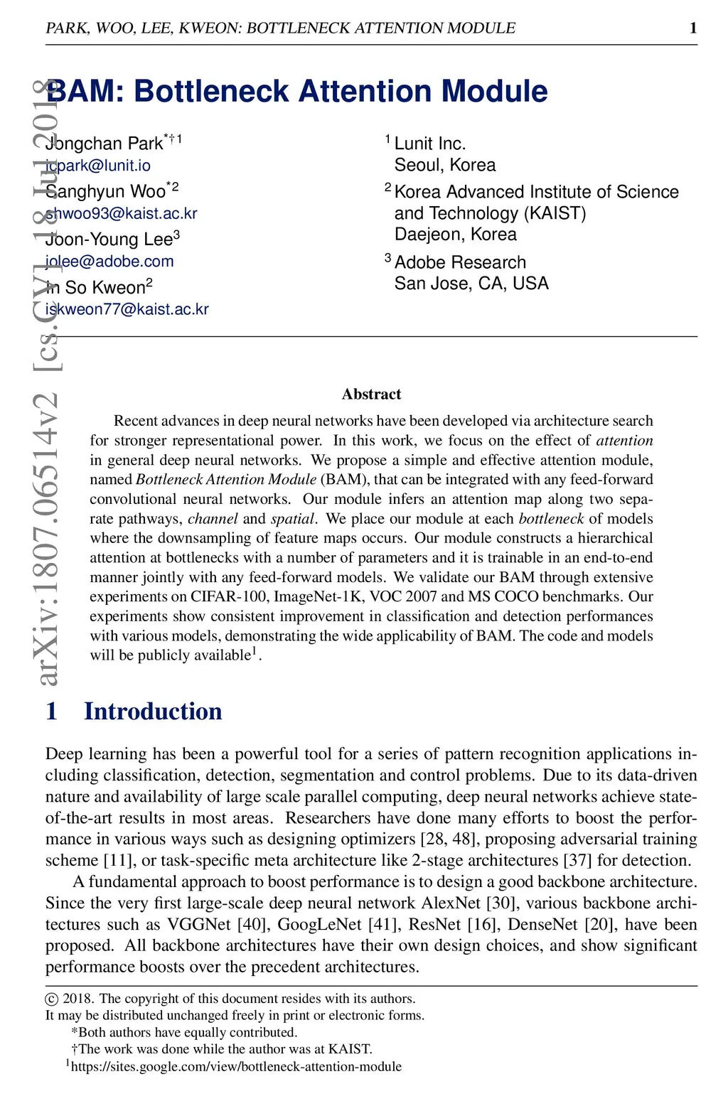 Recent advances in deep neural networks have been developed via architecture search for stronger representational power. In this work, we focus on the effect of attention in general deep neural networks. We propose a simple and effective attention module, named Bottleneck Attention Module (BAM), that can be integrated with any feed-forward convolutional neural networks. Our module infers an attention map along two separate pathways, channel and spatial. We place our module at each bottleneck of models where the downsampling of feature maps occurs. Our module constructs a hierarchical attention at bottlenecks with a number of parameters and it is trainable in an end-to-end manner jointly with any feed-forward models. We validate our BAM through extensive experiments on CIFAR-100, ImageNet-1K, VOC 2007 and MS COCO benchmarks. Our experiments show consistent improvement in classification and detection performances with various models, demonstrating the wide applicability of BAM. The code and models will be publicly available.