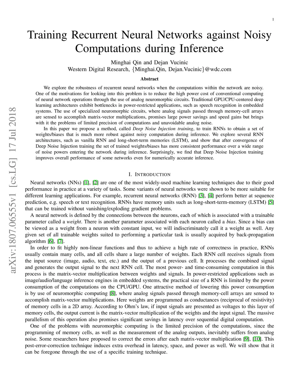 We explore the robustness of recurrent neural networks when the computations within the network are noisy. One of the motivations for looking into this problem is to reduce the high power cost of conventional computing of neural network operations through the use of analog neuromorphic circuits. Traditional GPU/CPU-centered deep learning architectures exhibit bottlenecks in power-restricted applications, such as speech recognition in embedded systems. The use of specialized neuromorphic circuits, where analog signals passed through memory-cell arrays are sensed to accomplish matrix-vector multiplications, promises large power savings and speed gains but brings with it the problems of limited precision of computations and unavoidable analog noise. In this paper we propose a method, called {\em Deep Noise Injection training}, to train RNNs to obtain a set of weights/biases that is much more robust against noisy computation during inference. We explore several RNN architectures, such as vanilla RNN and long-short-term memories (LSTM), and show that after convergence of Deep Noise Injection training the set of trained weights/biases has more consistent performance over a wide range of noise powers entering the network during inference. Surprisingly, we find that Deep Noise Injection training improves overall performance of some networks even for numerically accurate inference.