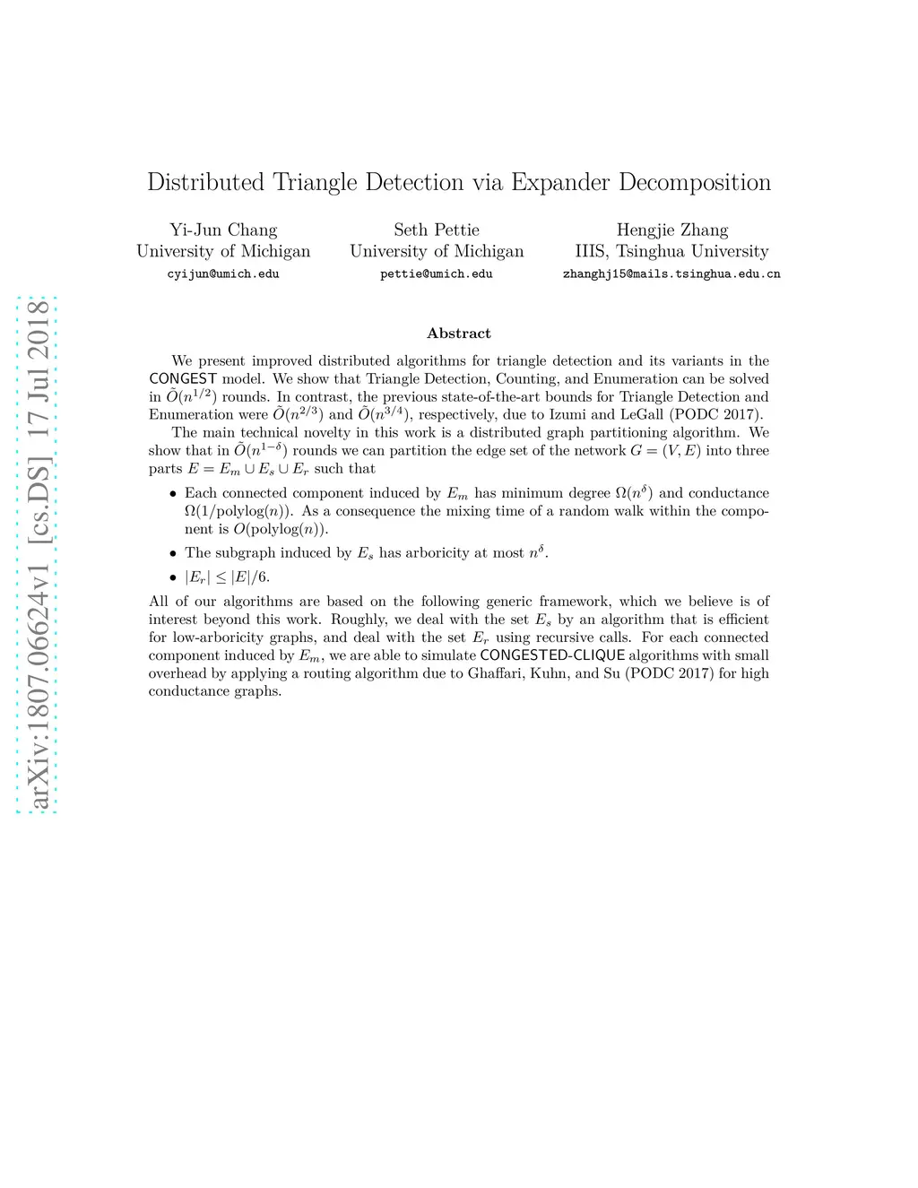 We present improved distributed algorithms for triangle detection and its variants in the CONGEST model. We show that Triangle Detection, Counting, and Enumeration can be solved in rounds. In contrast, the previous state-of-the-art bounds for Triangle Detection and Enumeration were and , respectively, due to Izumi and LeGall (PODC 2017). The main technical novelty in this work is a distributed graph partitioning algorithm. We show that in rounds we can partition the edge set of the network into three parts such that (a) Each connected component induced by has minimum degree and conductance . As a consequence the mixing time of a random walk within the component is . (b) The subgraph induced by has arboricity at most . (c) . All of our algorithms are based on the following generic framework, which we believe is of interest beyond this work. Roughly, we deal with the set by an algorithm that is efficient for low-arboricity graphs, and deal with the set using recursive calls. For each connected component induced by , we are able to simulate congested clique algorithms with small overhead by applying a routing algorithm due to Ghaffari, Kuhn, and Su (PODC 2017) for high conductance graphs.