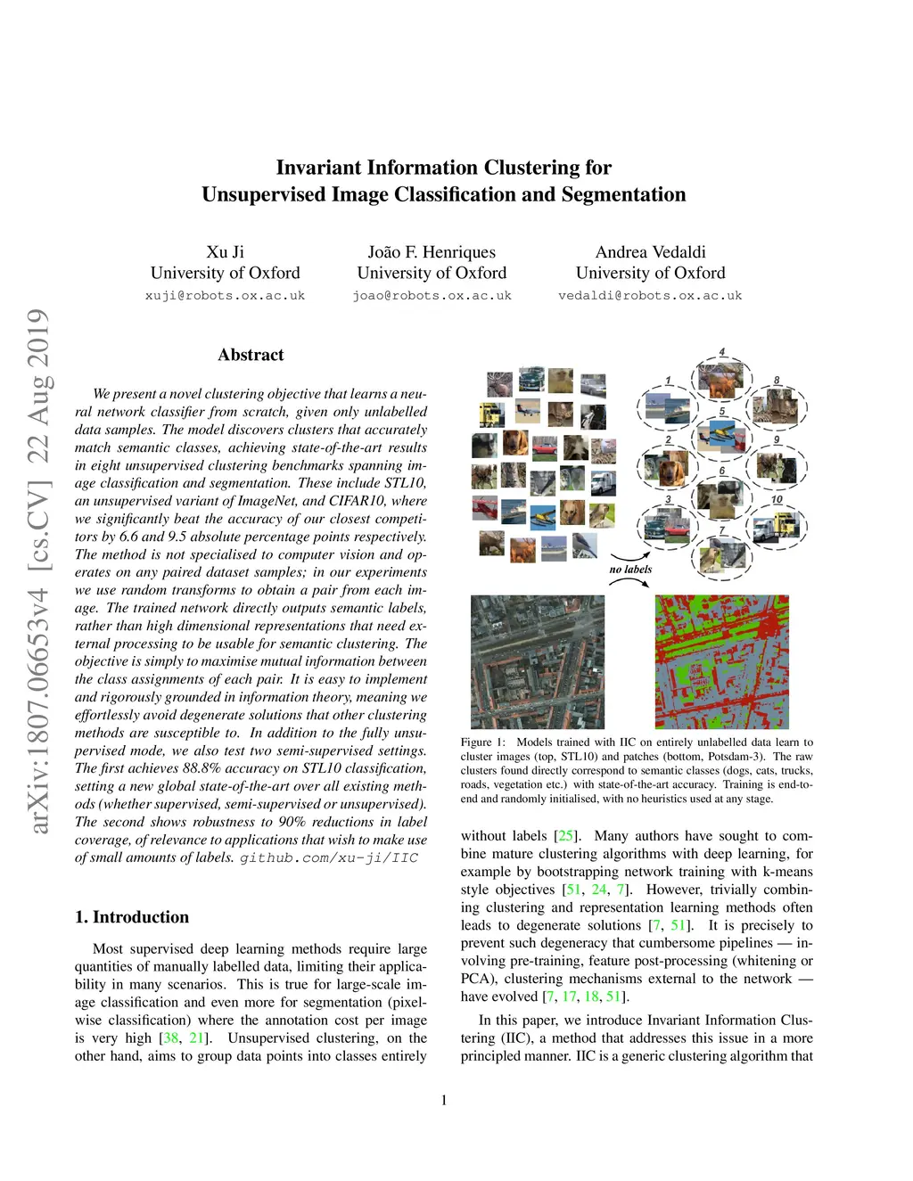 We present a novel clustering objective that learns a neural network classifier from scratch, given only unlabelled data samples. The model discovers clusters that accurately match semantic classes, achieving state-of-the-art results in eight unsupervised clustering benchmarks spanning image classification and segmentation. These include STL10, an unsupervised variant of ImageNet, and CIFAR10, where we significantly beat the accuracy of our closest competitors by 8 and 9.5 absolute percentage points respectively. The method is not specialised to computer vision and operates on any paired dataset samples; in our experiments we use random transforms to obtain a pair from each image. The trained network directly outputs semantic labels, rather than high dimensional representations that need external processing to be usable for semantic clustering. The objective is simply to maximise mutual information between the class assignments of each pair. It is easy to implement and rigorously grounded in information theory, meaning we effortlessly avoid degenerate solutions that other clustering methods are susceptible to. In addition to the fully unsupervised mode, we also test two semi-supervised settings. The first achieves 88.8% accuracy on STL10 classification, setting a new global state-of-the-art over all existing methods (whether supervised, semi supervised or unsupervised). The second shows robustness to 90% reductions in label coverage, of relevance to applications that wish to make use of small amounts of labels. github.com/xu-ji/IIC
