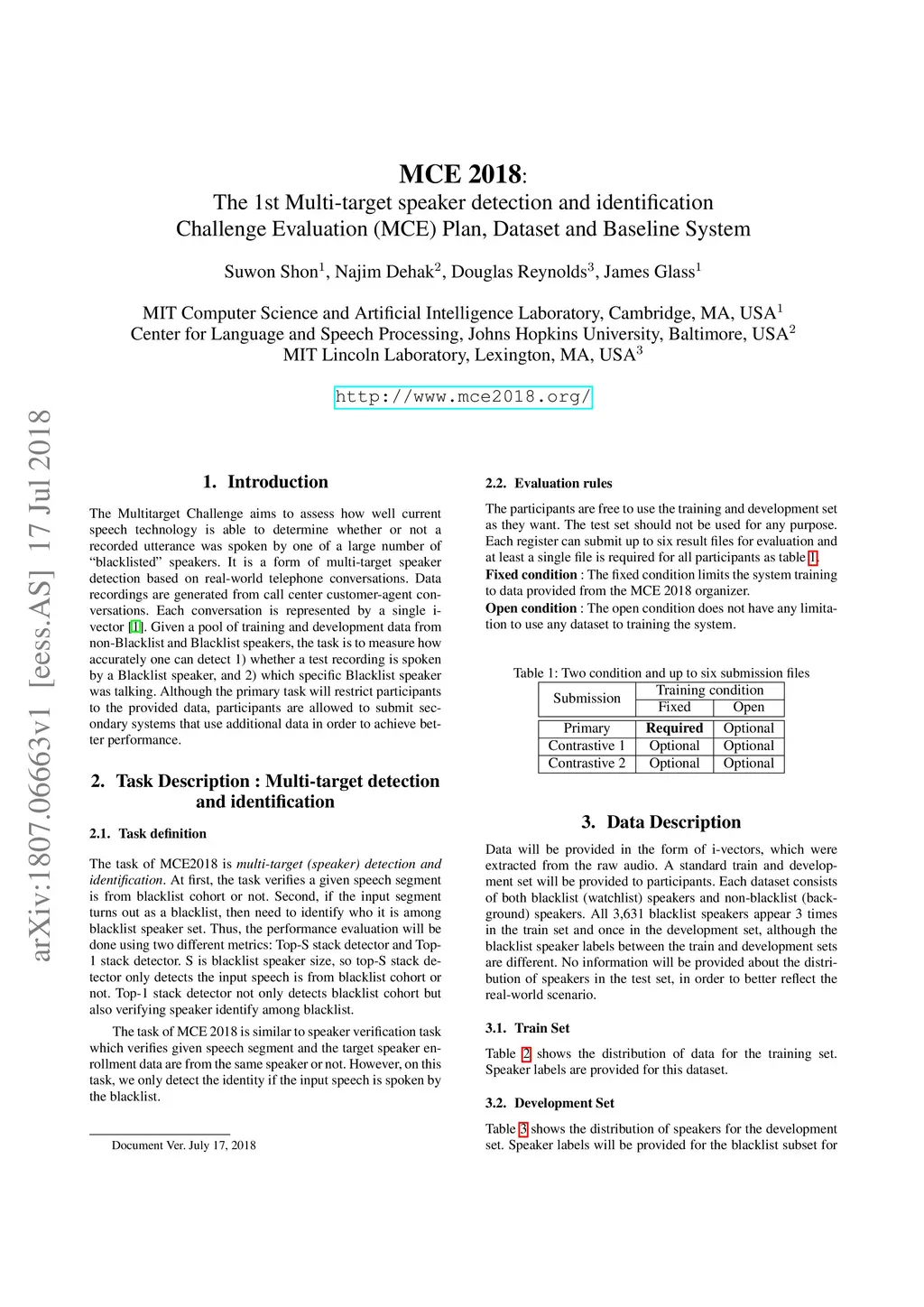 The Multitarget Challenge aims to assess how well current speech technology is able to determine whether or not a recorded utterance was spoken by one of a large number of 'blacklisted' speakers. It is a form of multi-target speaker detection based on real-world telephone conversations. Data recordings are generated from call center customer-agent conversations. Each conversation is represented by a single i-vector. Given a pool of training and development data from non-Blacklist and Blacklist speakers, the task is to measure how accurately one can detect 1) whether a test recording is spoken by a Blacklist speaker, and 2) which specific Blacklist speaker was talking.