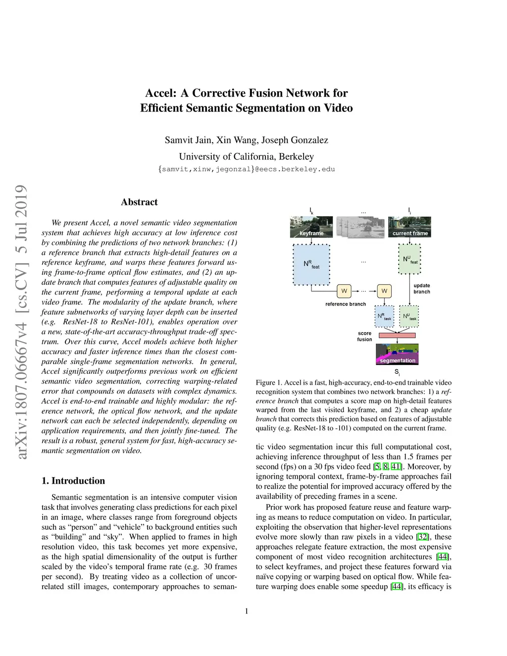 We present Accel, a novel semantic video segmentation system that achieves high accuracy at low inference cost by combining the predictions of two network branches: (1) a reference branch that extracts high-detail features on a reference keyframe, and warps these features forward using frame-to-frame optical flow estimates, and (2) an update branch that computes features of adjustable quality on the current frame, performing a temporal update at each video frame. The modularity of the update branch, where feature subnetworks of varying layer depth can be inserted (e.g. ResNet-18 to ResNet-101), enables operation over a new, state-of-the-art accuracy-throughput trade-off spectrum. Over this curve, Accel models achieve both higher accuracy and faster inference times than the closest comparable single-frame segmentation networks. In general, Accel significantly outperforms previous work on efficient semantic video segmentation, correcting warping-related error that compounds on datasets with complex dynamics. Accel is end-to-end trainable and highly modular: the reference network, the optical flow network, and the update network can each be selected independently, depending on application requirements, and then jointly fine-tuned. The result is a robust, general system for fast, high-accuracy semantic segmentation on video.