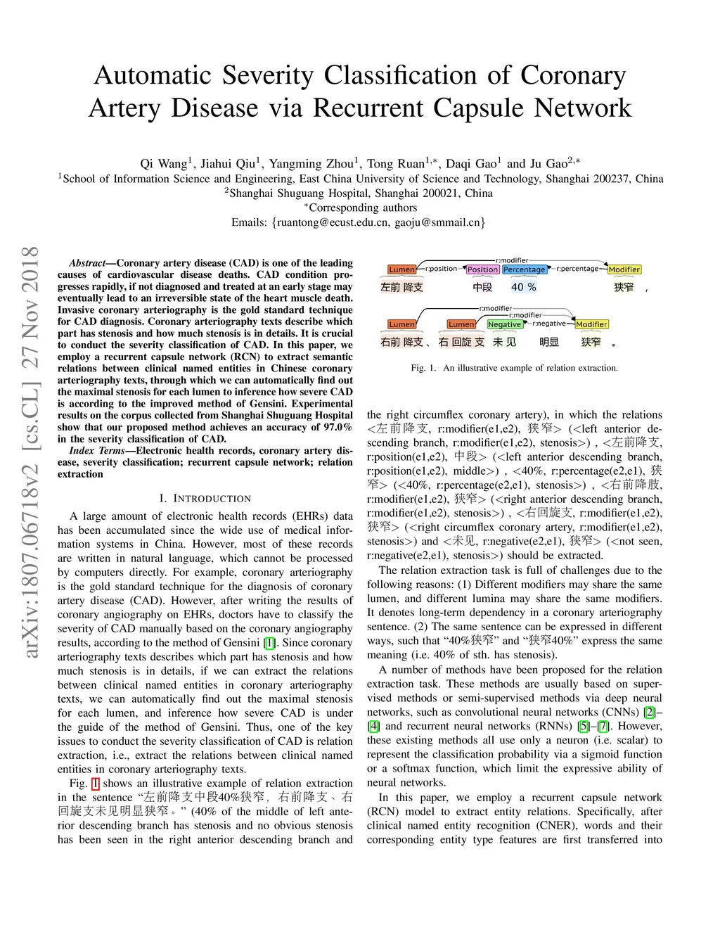 Coronary artery disease (CAD) is one of the leading causes of cardiovascular disease deaths. CAD condition progresses rapidly, if not diagnosed and treated at an early stage may eventually lead to an irreversible state of the heart muscle death. Invasive coronary arteriography is the gold standard technique for CAD diagnosis. Coronary arteriography texts describe which part has stenosis and how much stenosis is in details. It is crucial to conduct the severity classification of CAD. In this paper, we employ a recurrent capsule network (RCN) to extract semantic relations between clinical named entities in Chinese coronary arteriography texts, through which we can automatically find out the maximal stenosis for each lumen to inference how severe CAD is according to the improved method of Gensini. Experimental results on the corpus collected from Shanghai Shuguang Hospital show that our proposed method achieves an accuracy of 97.0\% in the severity classification of CAD.