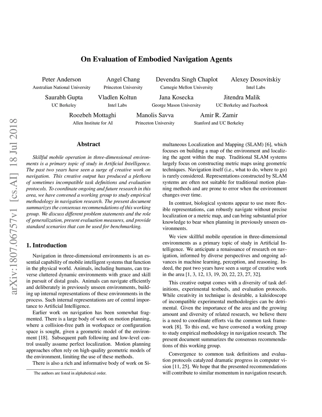 Skillful mobile operation in three-dimensional environments is a primary topic of study in Artificial Intelligence. The past two years have seen a surge of creative work on navigation. This creative output has produced a plethora of sometimes incompatible task definitions and evaluation protocols. To coordinate ongoing and future research in this area, we have convened a working group to study empirical methodology in navigation research. The present document summarizes the consensus recommendations of this working group. We discuss different problem statements and the role of generalization, present evaluation measures, and provide standard scenarios that can be used for benchmarking.