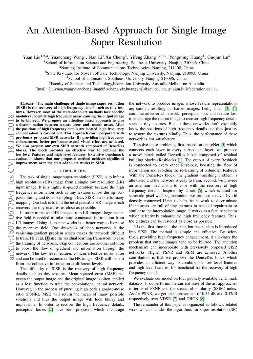 The main challenge of single image super resolution (SISR) is the recovery of high frequency details such as tiny textures. However, most of the state-of-the-art methods lack specific modules to identify high frequency areas, causing the output image to be blurred. We propose an attention-based approach to give a discrimination between texture areas and smooth areas. After the positions of high frequency details are located, high frequency compensation is carried out. This approach can incorporate with previously proposed SISR networks. By providing high frequency enhancement, better performance and visual effect are achieved. We also propose our own SISR network composed of DenseRes blocks. The block provides an effective way to combine the low level features and high level features. Extensive benchmark evaluation shows that our proposed method achieves significant improvement over the state-of-the-art works in SISR.
