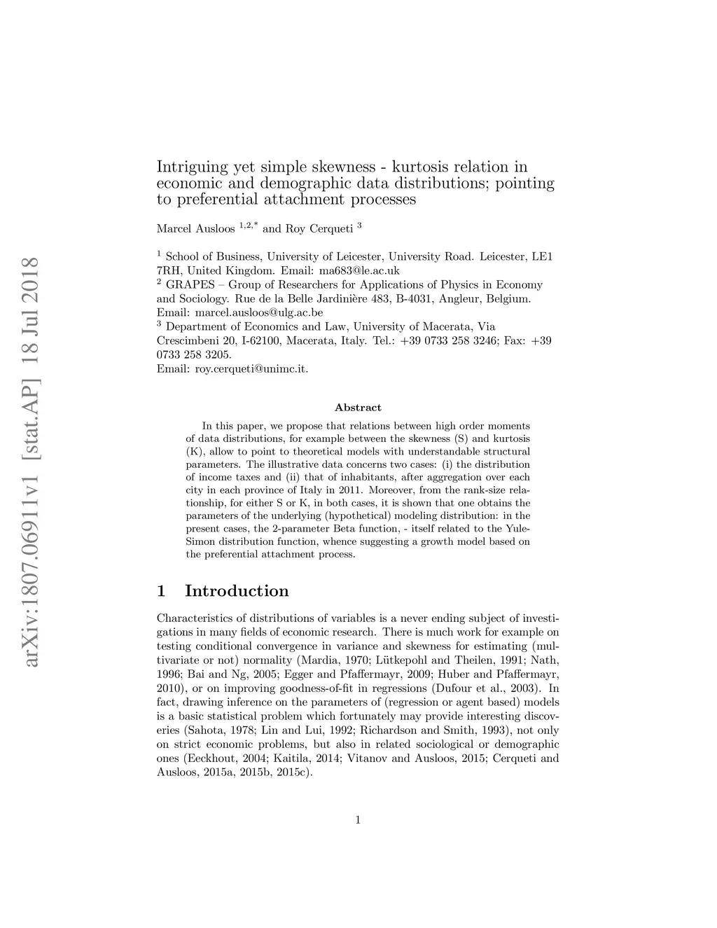 In this paper, we propose that relations between high order moments of data distributions, for example between the skewness (S) and kurtosis (K), allow to point to theoretical models with understandable structural parameters. The illustrative data concerns two cases: (i) the distribution of income taxes and (ii) that of inhabitants, after aggregation over each city in each province of Italy in 2011. Moreover, from the rank-size relationship, for either S or K, in both cases, it is shown that one obtains the parameters of the underlying (hypothetical) modeling distribution: in the present cases, the 2-parameter Beta function, - itself related to the Yule-Simon distribution function, whence suggesting a growth model based on the preferential attachment process.