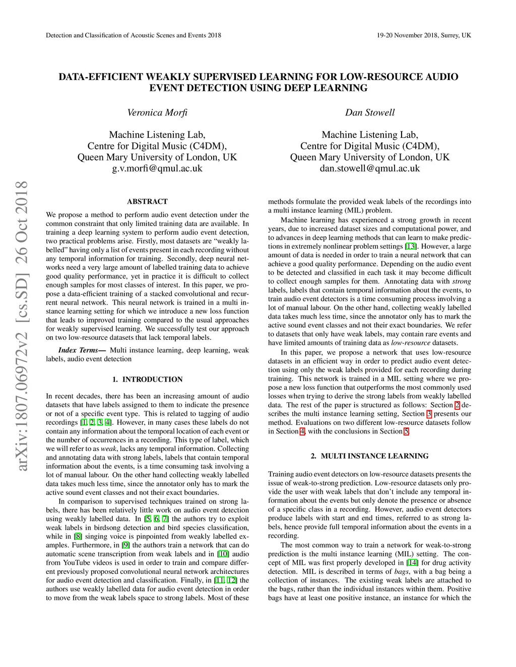 We propose a method to perform audio event detection under the common constraint that only limited training data are available. In training a deep learning system to perform audio event detection, two practical problems arise. Firstly, most datasets are "weakly labelled" having only a list of events present in each recording without any temporal information for training. Secondly, deep neural networks need a very large amount of labelled training data to achieve good quality performance, yet in practice it is difficult to collect enough samples for most classes of interest. In this paper, we propose a data-efficient training of a stacked convolutional and recurrent neural network. This neural network is trained in a multi instance learning setting for which we introduce a new loss function that leads to improved training compared to the usual approaches for weakly supervised learning. We successfully test our approach on two low-resource datasets that lack temporal labels.