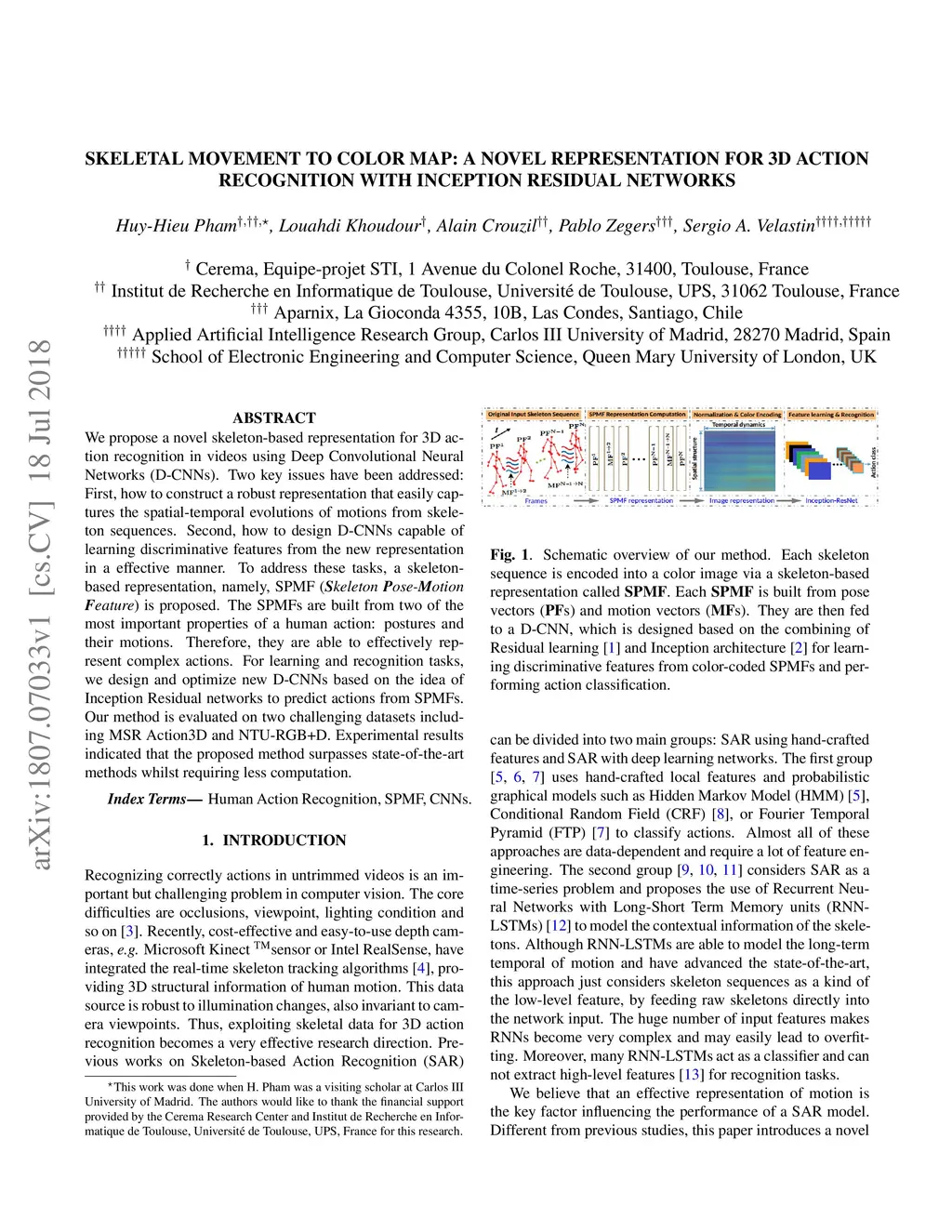 We propose a novel skeleton-based representation for 3D action recognition in videos using Deep Convolutional Neural Networks (D-CNNs). Two key issues have been addressed: First, how to construct a robust representation that easily captures the spatial-temporal evolutions of motions from skeleton sequences. Second, how to design D-CNNs capable of learning discriminative features from the new representation in a effective manner. To address these tasks, a skeletonbased representation, namely, SPMF (Skeleton Pose-Motion Feature) is proposed. The SPMFs are built from two of the most important properties of a human action: postures and their motions. Therefore, they are able to effectively represent complex actions. For learning and recognition tasks, we design and optimize new D-CNNs based on the idea of Inception Residual networks to predict actions from SPMFs. Our method is evaluated on two challenging datasets including MSR Action3D and NTU-RGB+D. Experimental results indicated that the proposed method surpasses state-of-the-art methods whilst requiring less computation.