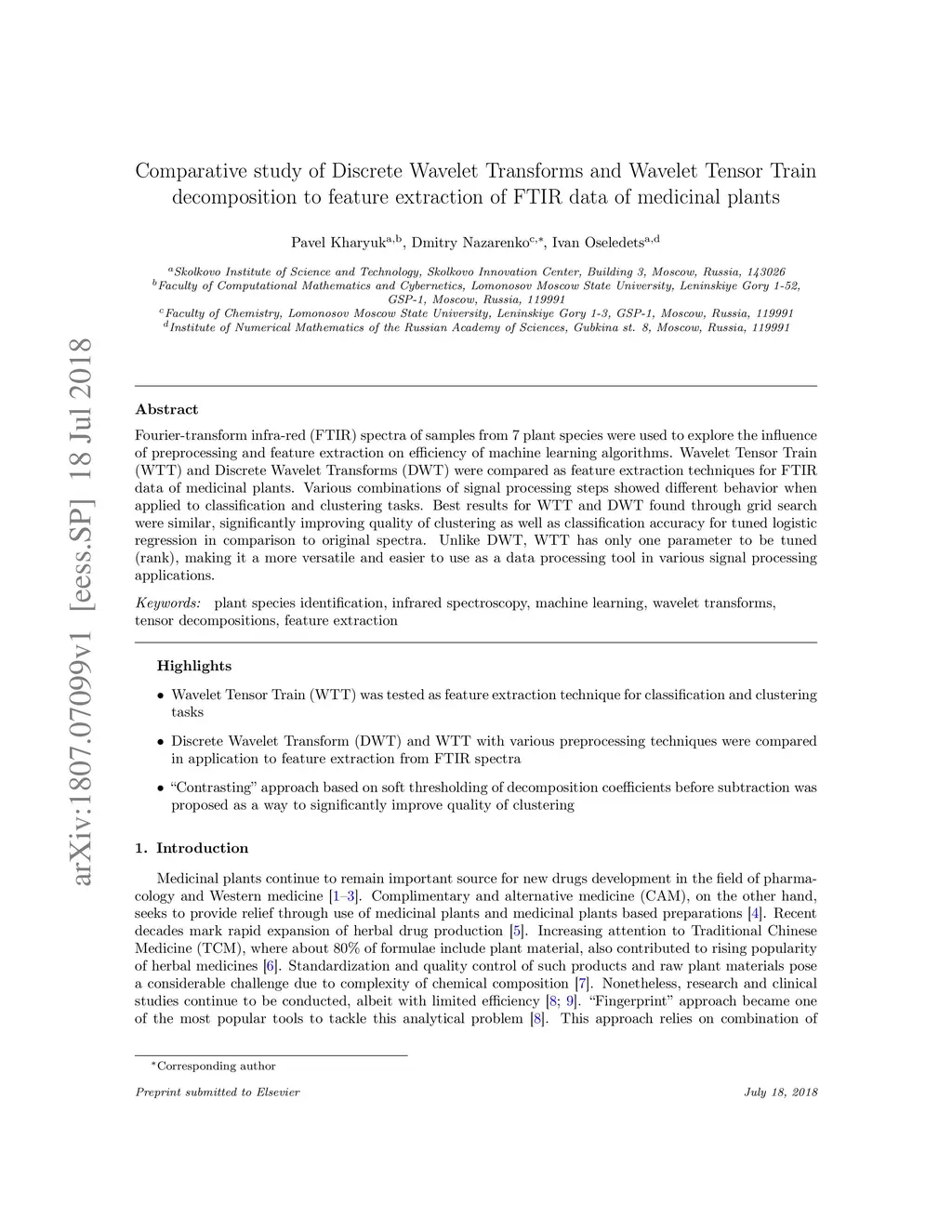 Fourier-transform infra-red (FTIR) spectra of samples from 7 plant species were used to explore the influence of preprocessing and feature extraction on efficiency of machine learning algorithms. Wavelet Tensor Train (WTT) and Discrete Wavelet Transforms (DWT) were compared as feature extraction techniques for FTIR data of medicinal plants. Various combinations of signal processing steps showed different behavior when applied to classification and clustering tasks. Best results for WTT and DWT found through grid search were similar, significantly improving quality of clustering as well as classification accuracy for tuned logistic regression in comparison to original spectra. Unlike DWT, WTT has only one parameter to be tuned (rank), making it a more versatile and easier to use as a data processing tool in various signal processing applications.