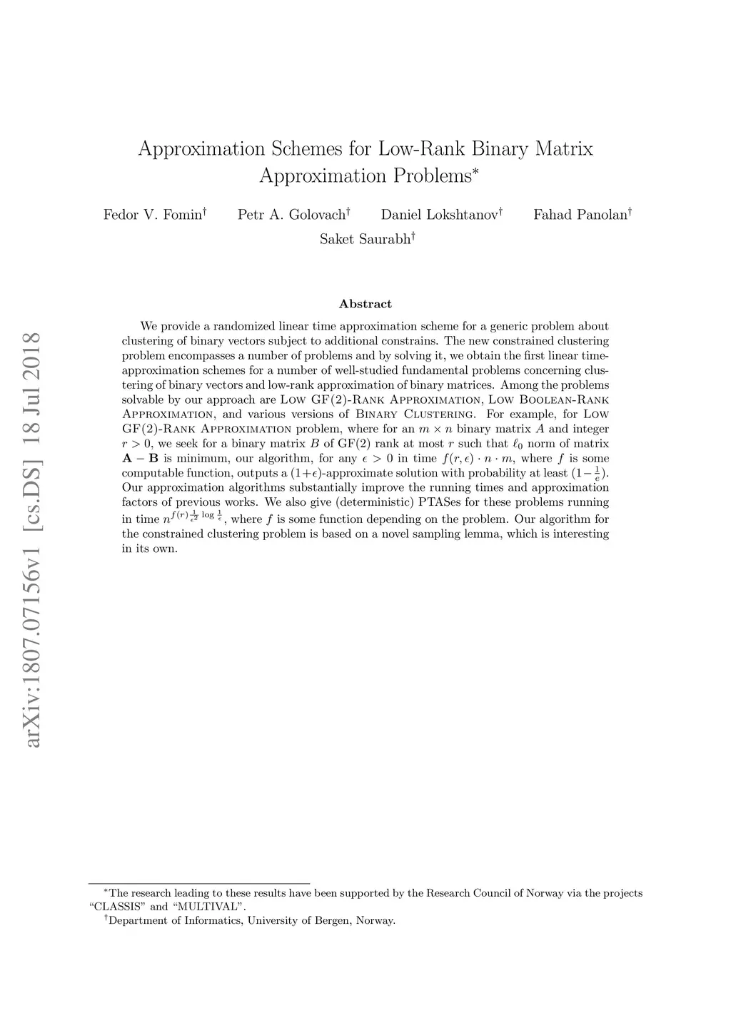 We provide a randomized linear time approximation scheme for a generic problem about clustering of binary vectors subject to additional constrains. The new constrained clustering problem encompasses a number of problems and by solving it, we obtain the first linear time-approximation schemes for a number of well-studied fundamental problems concerning clustering of binary vectors and low-rank approximation of binary matrices. Among the problems solvable by our approach are \textsc{Low GF(2)-Rank Approximation}, \textsc{Low Boolean-Rank Approximation}, and various versions of \textsc{Binary Clustering}. For example, for \textsc{Low GF(2)-Rank Approximation} problem, where for an binary matrix and integer , we seek for a binary matrix of rank at most such that norm of matrix is minimum, our algorithm, for any in time $ f(r,\epsilon)\cdot n\cdot m$, where is some computable function, outputs a -approximate solution with probability at least . Our approximation algorithms substantially improve the running times and approximation factors of previous works. We also give (deterministic) PTASes for these problems running in time , where is some function depending on the problem. Our algorithm for the constrained clustering problem is based on a novel sampling lemma, which is interesting in its own.