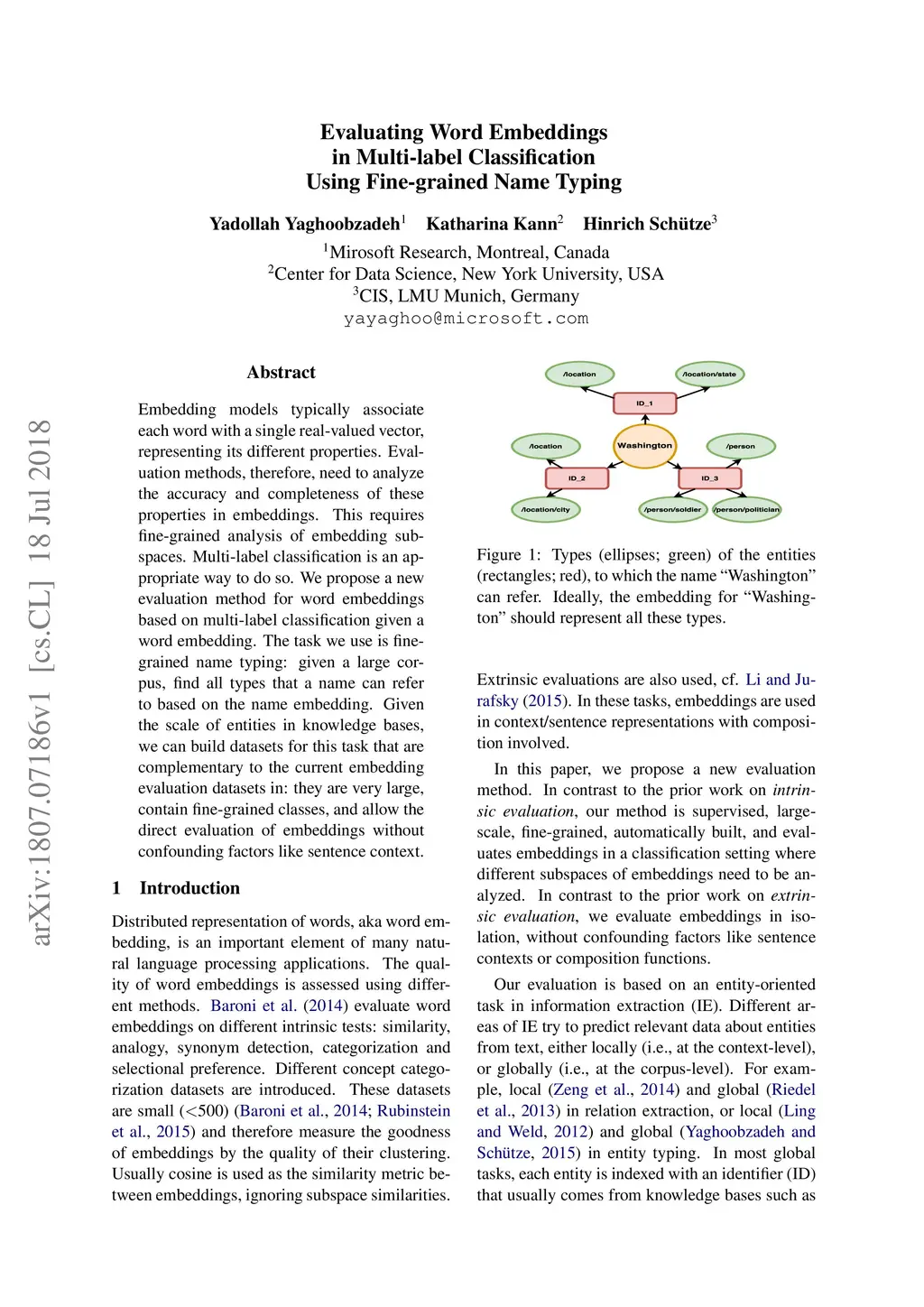 Embedding models typically associate each word with a single real-valued vector, representing its different properties. Evaluation methods, therefore, need to analyze the accuracy and completeness of these properties in embeddings. This requires fine-grained analysis of embedding subspaces. Multi-label classification is an appropriate way to do so. We propose a new evaluation method for word embeddings based on multi-label classification given a word embedding. The task we use is fine-grained name typing: given a large corpus, find all types that a name can refer to based on the name embedding. Given the scale of entities in knowledge bases, we can build datasets for this task that are complementary to the current embedding evaluation datasets in: they are very large, contain fine-grained classes, and allow the direct evaluation of embeddings without confounding factors like sentence context