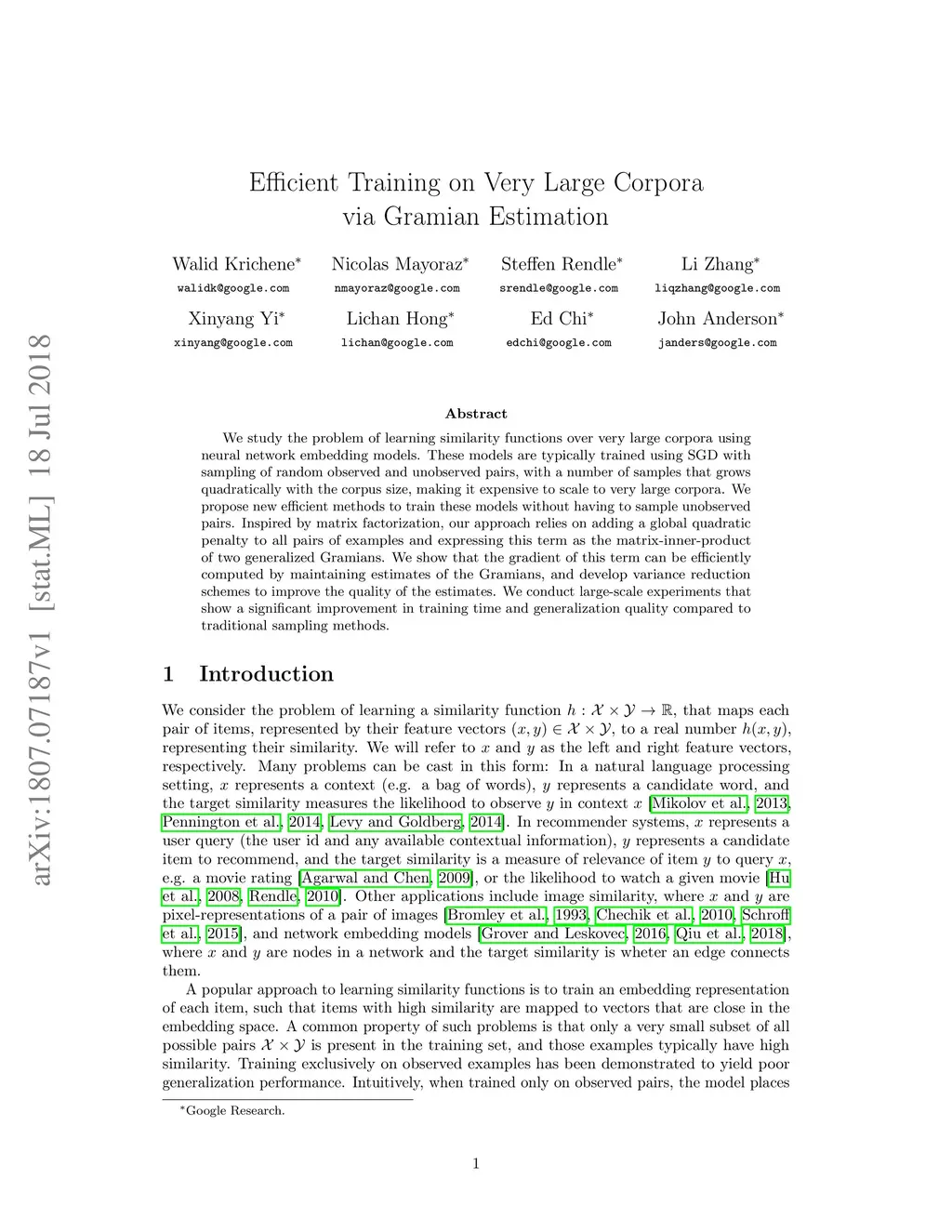 We study the problem of learning similarity functions over very large corpora using neural network embedding models. These models are typically trained using SGD with sampling of random observed and unobserved pairs, with a number of samples that grows quadratically with the corpus size, making it expensive to scale to very large corpora. We propose new efficient methods to train these models without having to sample unobserved pairs. Inspired by matrix factorization, our approach relies on adding a global quadratic penalty to all pairs of examples and expressing this term as the matrix-inner-product of two generalized Gramians. We show that the gradient of this term can be efficiently computed by maintaining estimates of the Gramians, and develop variance reduction schemes to improve the quality of the estimates. We conduct large-scale experiments that show a significant improvement in training time and generalization quality compared to traditional sampling methods.