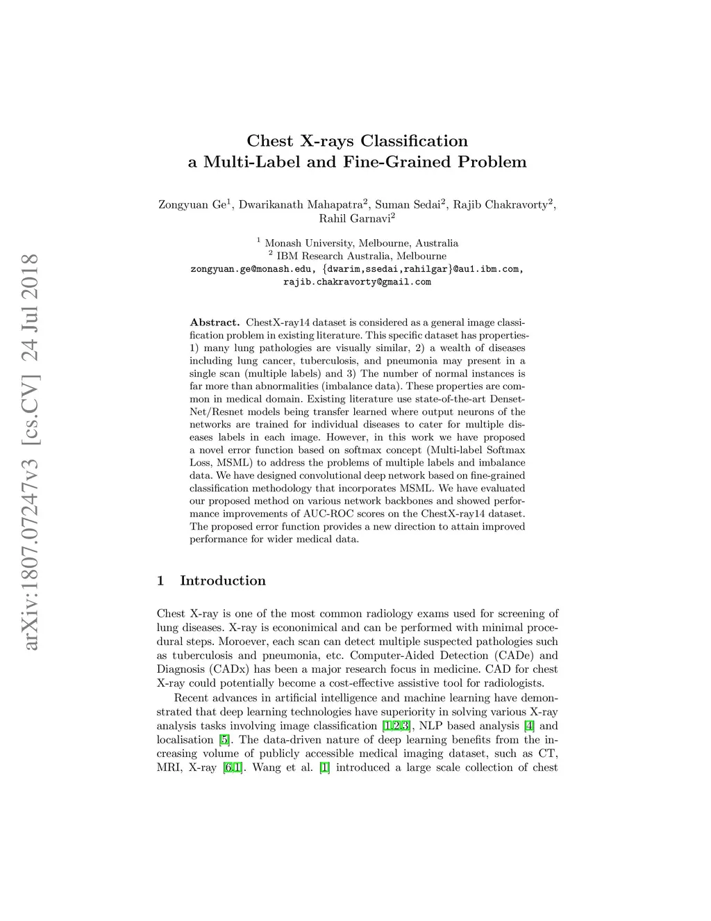 The widely used ChestX-ray14 dataset addresses an important medical image classification problem and has the following caveats: 1) many lung pathologies are visually similar, 2) a variant of diseases including lung cancer, tuberculosis, and pneumonia are present in a single scan, i.e. multiple labels and 3) The incidence of healthy images is much larger than diseased samples, creating imbalanced data. These properties are common in medical domain. Existing literature uses stateof- the-art DensetNet/Resnet models being transfer learned where output neurons of the networks are trained for individual diseases to cater for multiple diseases labels in each image. However, most of them don't consider relationship between multiple classes. In this work we have proposed a novel error function, Multi-label Softmax Loss (MSML), to specifically address the properties of multiple labels and imbalanced data. Moreover, we have designed deep network architecture based on fine-grained classification concept that incorporates MSML. We have evaluated our proposed method on various network backbones and showed consistent performance improvements of AUC-ROC scores on the ChestX-ray14 dataset. The proposed error function provides a new method to gain improved performance across wider medical datasets.