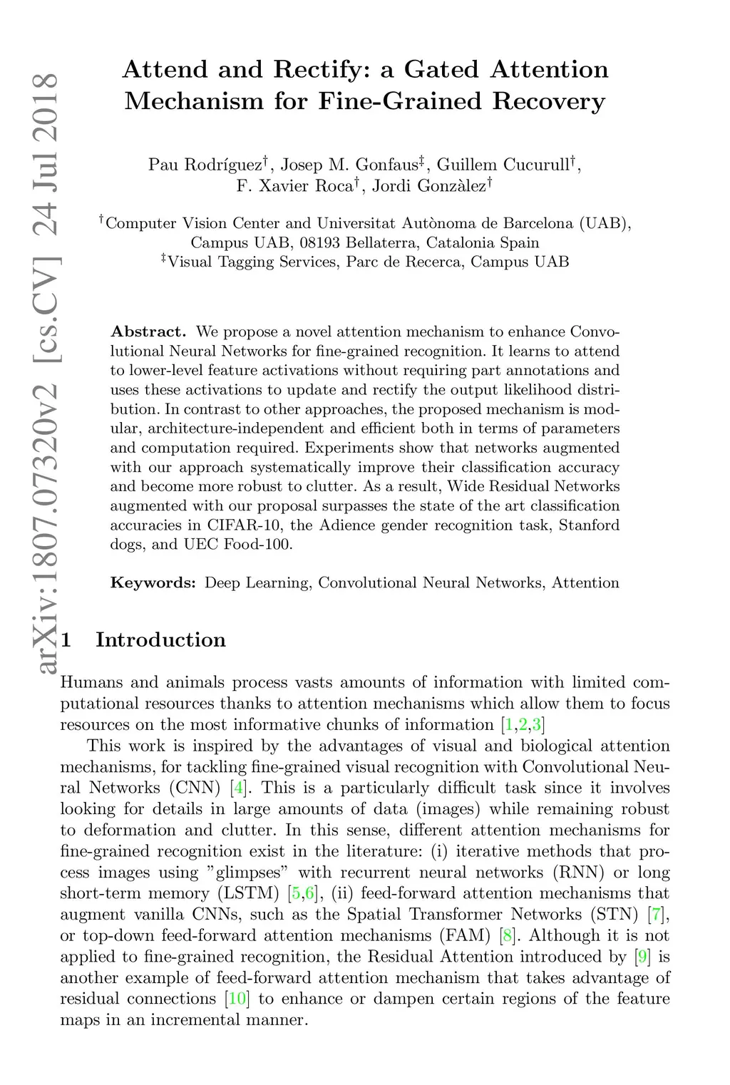 We propose a novel attention mechanism to enhance Convolutional Neural Networks for fine-grained recognition. It learns to attend to lower-level feature activations without requiring part annotations and uses these activations to update and rectify the output likelihood distribution. In contrast to other approaches, the proposed mechanism is modular, architecture-independent and efficient both in terms of parameters and computation required. Experiments show that networks augmented with our approach systematically improve their classification accuracy and become more robust to clutter. As a result, Wide Residual Networks augmented with our proposal surpasses the state of the art classification accuracies in CIFAR-10, the Adience gender recognition task, Stanford dogs, and UEC Food-100.