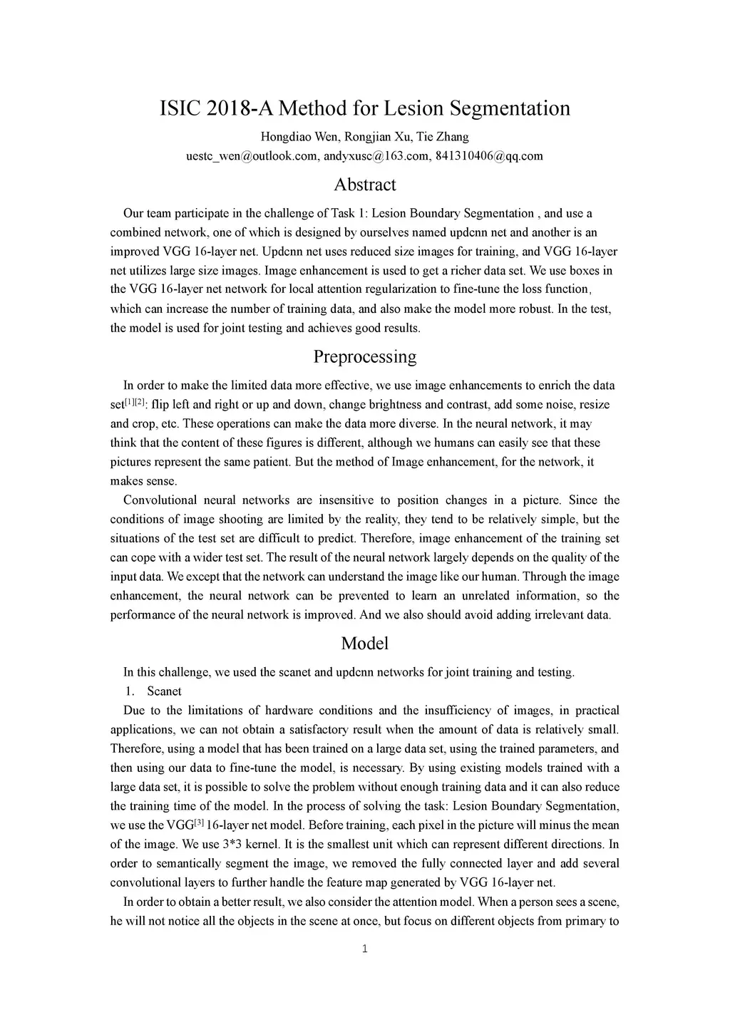 Our team participate in the challenge of Task 1: Lesion Boundary Segmentation , and use a combined network, one of which is designed by ourselves named updcnn net and another is an improved VGG 16-layer net. Updcnn net uses reduced size images for training, and VGG 16-layer net utilizes large size images. Image enhancement is used to get a richer data set. We use boxes in the VGG 16-layer net network for local attention regularization to fine-tune the loss function, which can increase the number of training data, and also make the model more robust. In the test, the model is used for joint testing and achieves good results.
