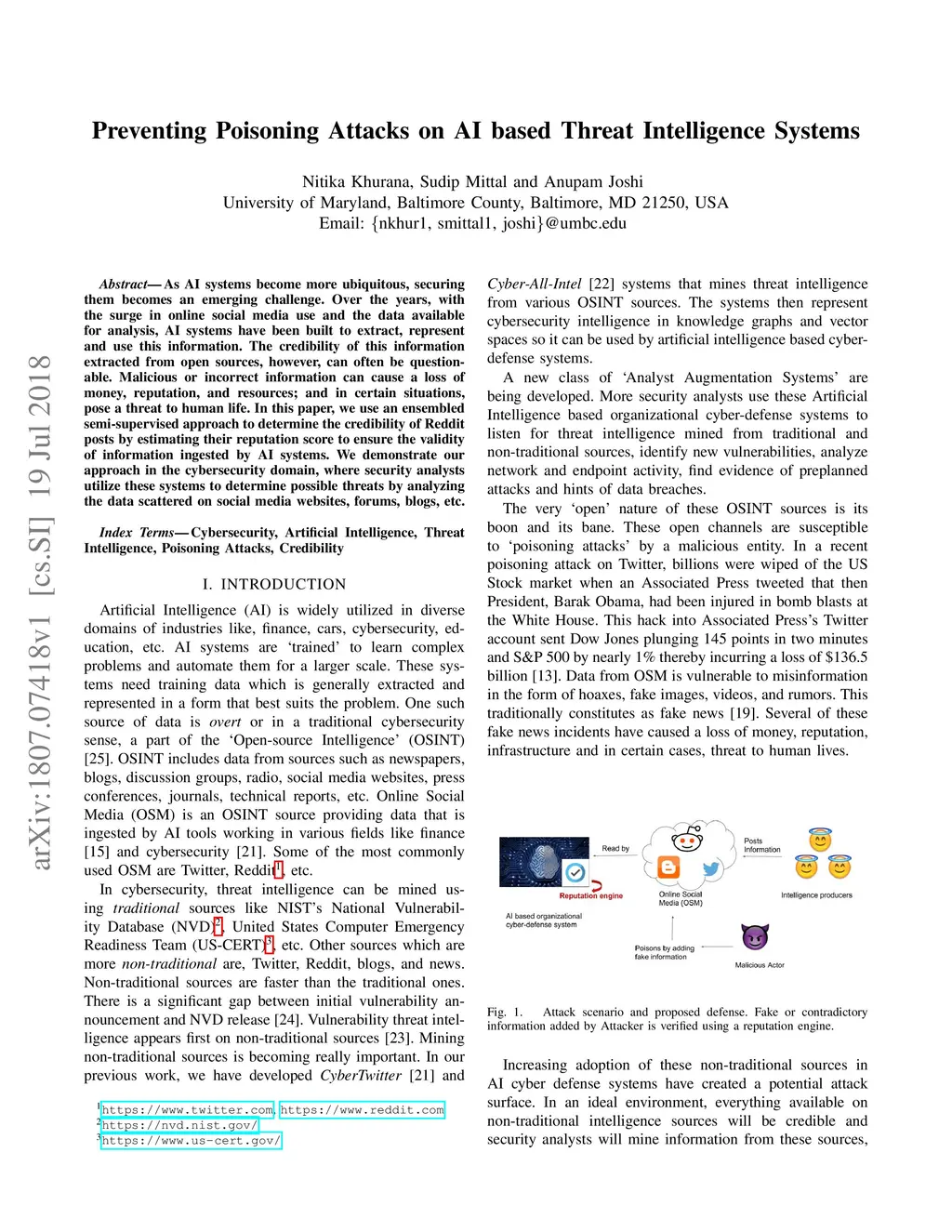 As AI systems become more ubiquitous, securing them becomes an emerging challenge. Over the years, with the surge in online social media use and the data available for analysis, AI systems have been built to extract, represent and use this information. The credibility of this information extracted from open sources, however, can often be questionable. Malicious or incorrect information can cause a loss of money, reputation, and resources; and in certain situations, pose a threat to human life. In this paper, we use an ensembled semi-supervised approach to determine the credibility of Reddit posts by estimating their reputation score to ensure the validity of information ingested by AI systems. We demonstrate our approach in the cybersecurity domain, where security analysts utilize these systems to determine possible threats by analyzing the data scattered on social media websites, forums, blogs, etc.