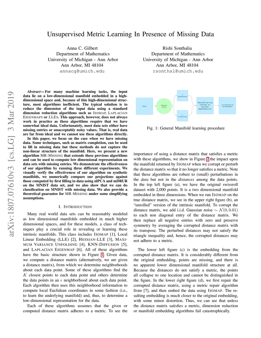 Unsupervised Metric Learning in Presence of Missing Data