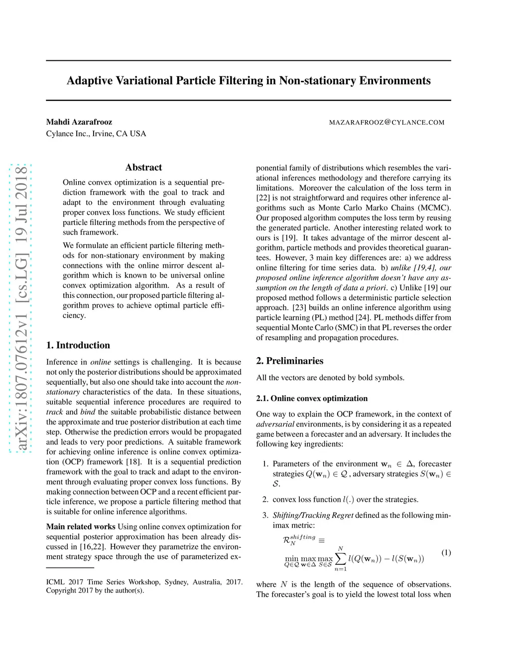 Online convex optimization is a sequential prediction framework with the goal to track and adapt to the environment through evaluating proper convex loss functions. We study efficient particle filtering methods from the perspective of such a framework. We formulate an efficient particle filtering methods for the non-stationary environment by making connections with the online mirror descent algorithm which is known to be a universal online convex optimization algorithm. As a result of this connection, our proposed particle filtering algorithm proves to achieve optimal particle efficiency.