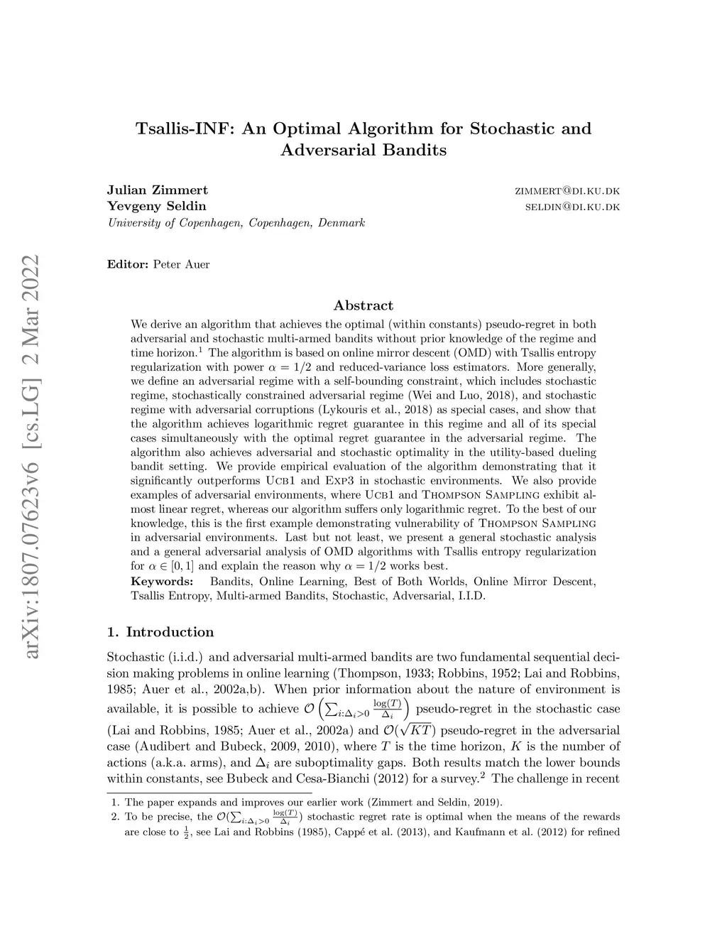 Tsallis-INF: An Optimal Algorithm for Stochastic and Adversarial Bandits