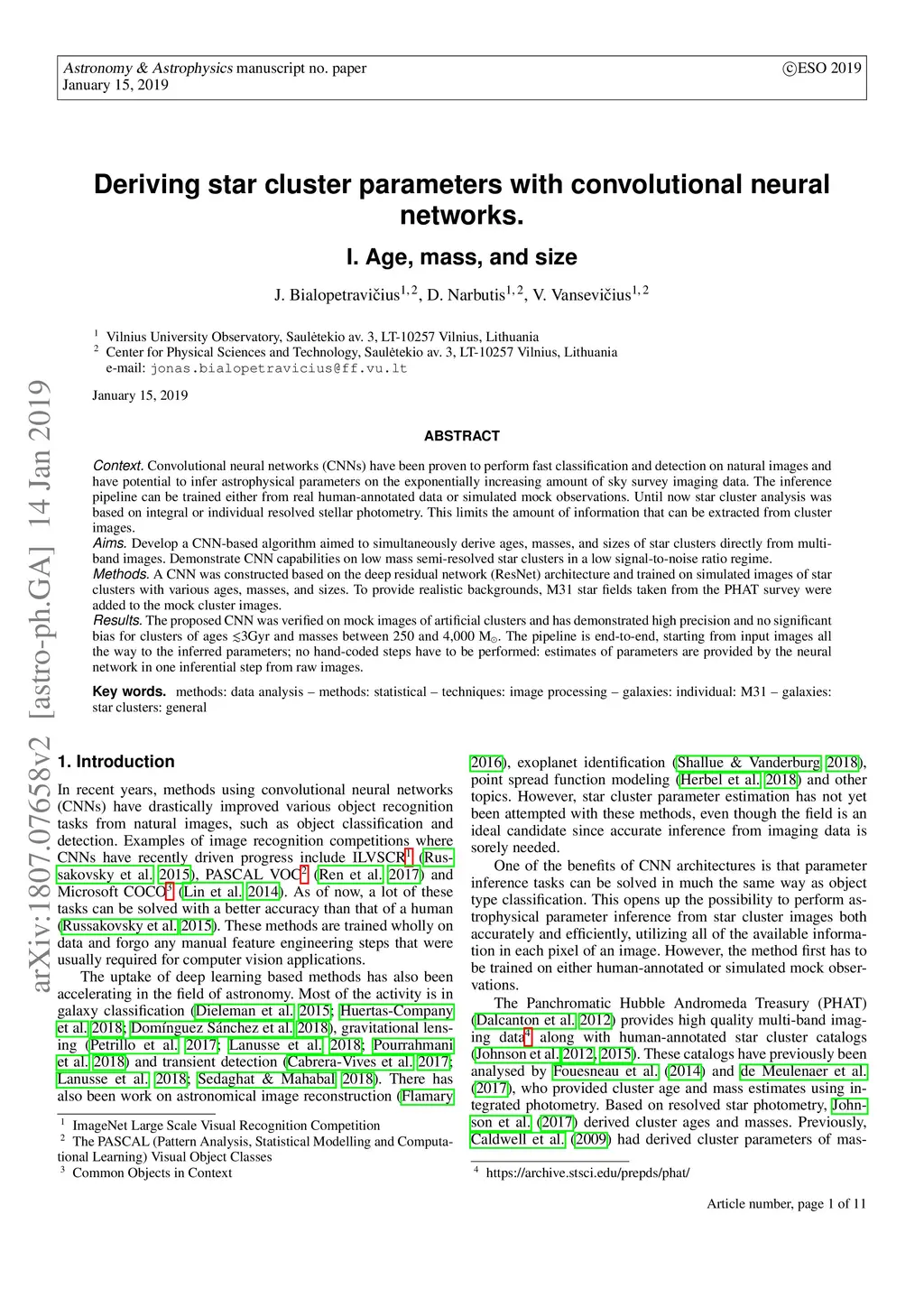 Context. Convolutional neural networks (CNNs) have been proven to perform fast classification and detection on natural images and have potential to infer astrophysical parameters on the exponentially increasing amount of sky survey imaging data. The inference pipeline can be trained either from real human-annotated data or simulated mock observations. Until now star cluster analysis was based on integral or individual resolved stellar photometry. This limits the amount of information that can be extracted from cluster images. Aims. Develop a CNN-based algorithm aimed to simultaneously derive ages, masses, and sizes of star clusters directly from multi-band images. Demonstrate CNN capabilities on low mass semi-resolved star clusters in a low signal-to-noise ratio regime. Methods. A CNN was constructed based on the deep residual network (ResNet) architecture and trained on simulated images of star clusters with various ages, masses, and sizes. To provide realistic backgrounds, M31 star fields taken from the PHAT survey were added to the mock cluster images. Results. The proposed CNN was verified on mock images of artificial clusters and has demonstrated high precision and no significant bias for clusters of ages 3Gyr and masses between 250 and 4,000 . The pipeline is end-to-end, starting from input images all the way to the inferred parameters; no hand-coded steps have to be performed: estimates of parameters are provided by the neural network in one inferential step from raw images.
