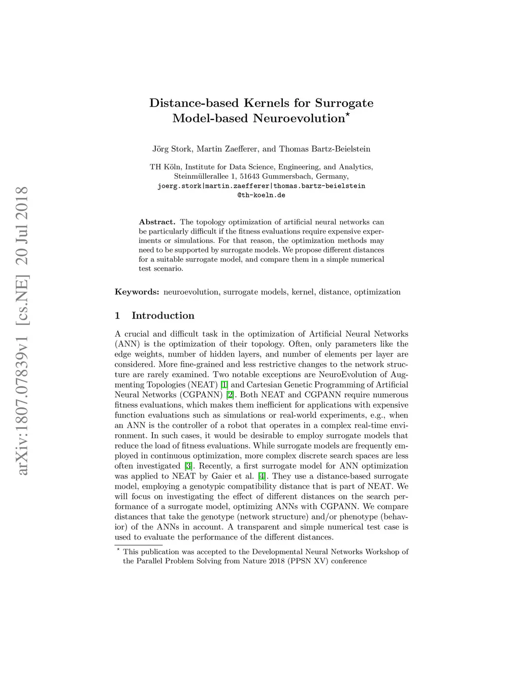 The topology optimization of artificial neural networks can be particularly difficult if the fitness evaluations require expensive experiments or simulations. For that reason, the optimization methods may need to be supported by surrogate models. We propose different distances for a suitable surrogate model, and compare them in a simple numerical test scenario.
