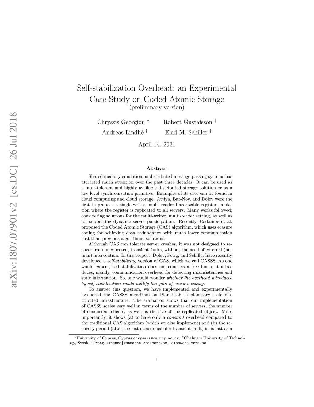 Shared memory emulation can be used as a fault-tolerant and highly available distributed storage solution or as a low-level synchronization primitive. Attiya, Bar-Noy, and Dolev were the first to propose a single-writer, multi-reader linearizable register emulation where the register is replicated to all servers. Recently, Cadambe et al. proposed the Coded Atomic Storage (CAS) algorithm, which uses erasure coding for achieving data redundancy with much lower communication cost than previous algorithmic solutions. Although CAS can tolerate server crashes, it was not designed to recover from unexpected, transient faults, without the need of external (human) intervention. In this respect, Dolev, Petig, and Schiller have recently developed a self-stabilizing version of CAS, which we call CASSS. As one would expect, self-stabilization does not come as a free lunch; it introduces, mainly, communication overhead for detecting inconsistencies and stale information. So, one would wonder whether the overhead introduced by self-stabilization would nullify the gain of erasure coding. To answer this question, we have implemented and experimentally evaluated the CASSS algorithm on PlanetLab; a planetary scale distributed infrastructure. The evaluation shows that our implementation of CASSS scales very well in terms of the number of servers, the number of concurrent clients, as well as the size of the replicated object. More importantly, it shows (a) to have only a constant overhead compared to the traditional CAS algorithm (which we also implement) and (b) the recovery period (after the last occurrence of a transient fault) is as fast as a few client (read/write) operations. Our results suggest that CASSS does not significantly impact efficiency while dealing with automatic recovery from transient faults and bounded size of needed resources.