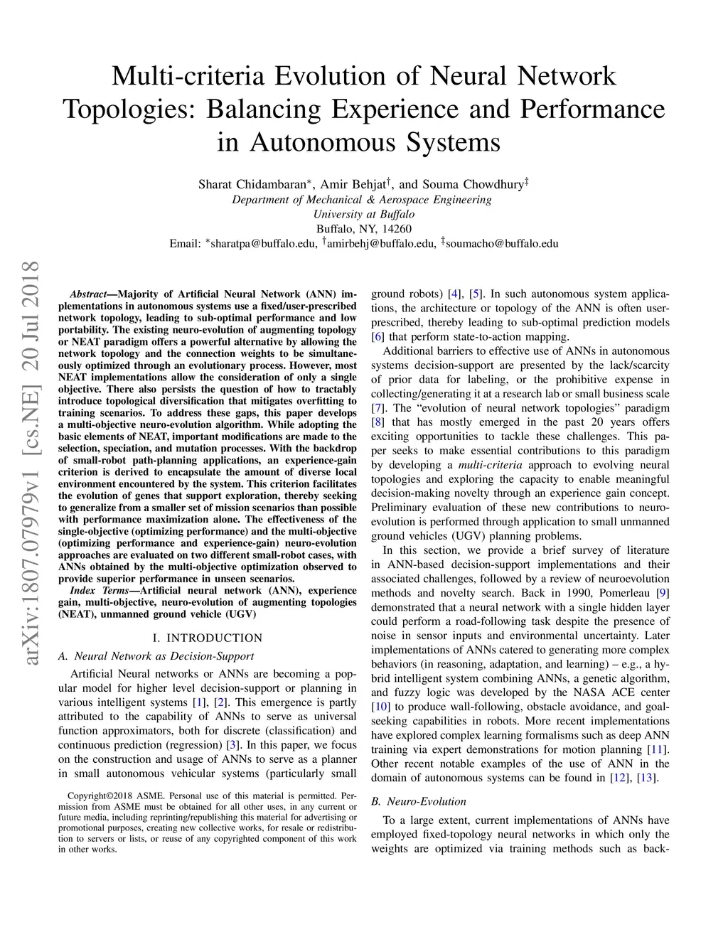 Majority of Artificial Neural Network (ANN) implementations in autonomous systems use a fixed/user-prescribed network topology, leading to sub-optimal performance and low portability. The existing neuro-evolution of augmenting topology or NEAT paradigm offers a powerful alternative by allowing the network topology and the connection weights to be simultaneously optimized through an evolutionary process. However, most NEAT implementations allow the consideration of only a single objective. There also persists the question of how to tractably introduce topological diversification that mitigates overfitting to training scenarios. To address these gaps, this paper develops a multi-objective neuro-evolution algorithm. While adopting the basic elements of NEAT, important modifications are made to the selection, speciation, and mutation processes. With the backdrop of small-robot path-planning applications, an experience-gain criterion is derived to encapsulate the amount of diverse local environment encountered by the system. This criterion facilitates the evolution of genes that support exploration, thereby seeking to generalize from a smaller set of mission scenarios than possible with performance maximization alone. The effectiveness of the single-objective (optimizing performance) and the multi-objective (optimizing performance and experience-gain) neuro-evolution approaches are evaluated on two different small-robot cases, with ANNs obtained by the multi-objective optimization observed to provide superior performance in unseen scenarios.