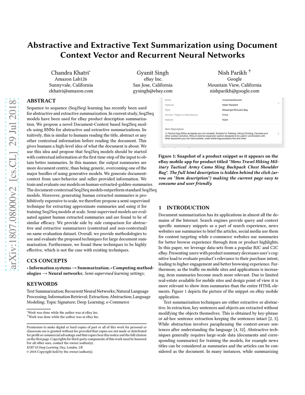 Sequence to sequence (Seq2Seq) learning has recently been used for abstractive and extractive summarization. In current study, Seq2Seq models have been used for eBay product description summarization. We propose a novel Document-Context based Seq2Seq models using RNNs for abstractive and extractive summarizations. Intuitively, this is similar to humans reading the title, abstract or any other contextual information before reading the document. This gives humans a high-level idea of what the document is about. We use this idea and propose that Seq2Seq models should be started with contextual information at the first time-step of the input to obtain better summaries. In this manner, the output summaries are more document centric, than being generic, overcoming one of the major hurdles of using generative models. We generate document-context from user-behavior and seller provided information. We train and evaluate our models on human-extracted-golden-summaries. The document-contextual Seq2Seq models outperform standard Seq2Seq models. Moreover, generating human extracted summaries is prohibitively expensive to scale, we therefore propose a semi-supervised technique for extracting approximate summaries and using it for training Seq2Seq models at scale. Semi-supervised models are evaluated against human extracted summaries and are found to be of similar efficacy. We provide side by side comparison for abstractive and extractive summarizers (contextual and non-contextual) on same evaluation dataset. Overall, we provide methodologies to use and evaluate the proposed techniques for large document summarization. Furthermore, we found these techniques to be highly effective, which is not the case with existing techniques.