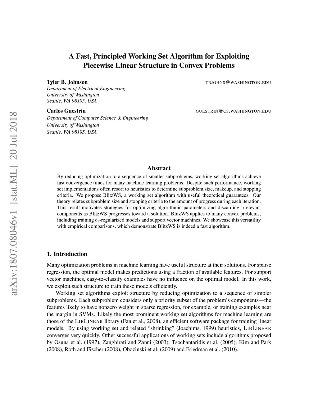 By reducing optimization to a sequence of smaller subproblems, working set algorithms achieve fast convergence times for many machine learning problems. Despite such performance, working set implementations often resort to heuristics to determine subproblem size, makeup, and stopping criteria. We propose BlitzWS, a working set algorithm with useful theoretical guarantees. Our theory relates subproblem size and stopping criteria to the amount of progress during each iteration. This result motivates strategies for optimizing algorithmic parameters and discarding irrelevant components as BlitzWS progresses toward a solution. BlitzWS applies to many convex problems, including training L1-regularized models and support vector machines. We showcase this versatility with empirical comparisons, which demonstrate BlitzWS is indeed a fast algorithm.