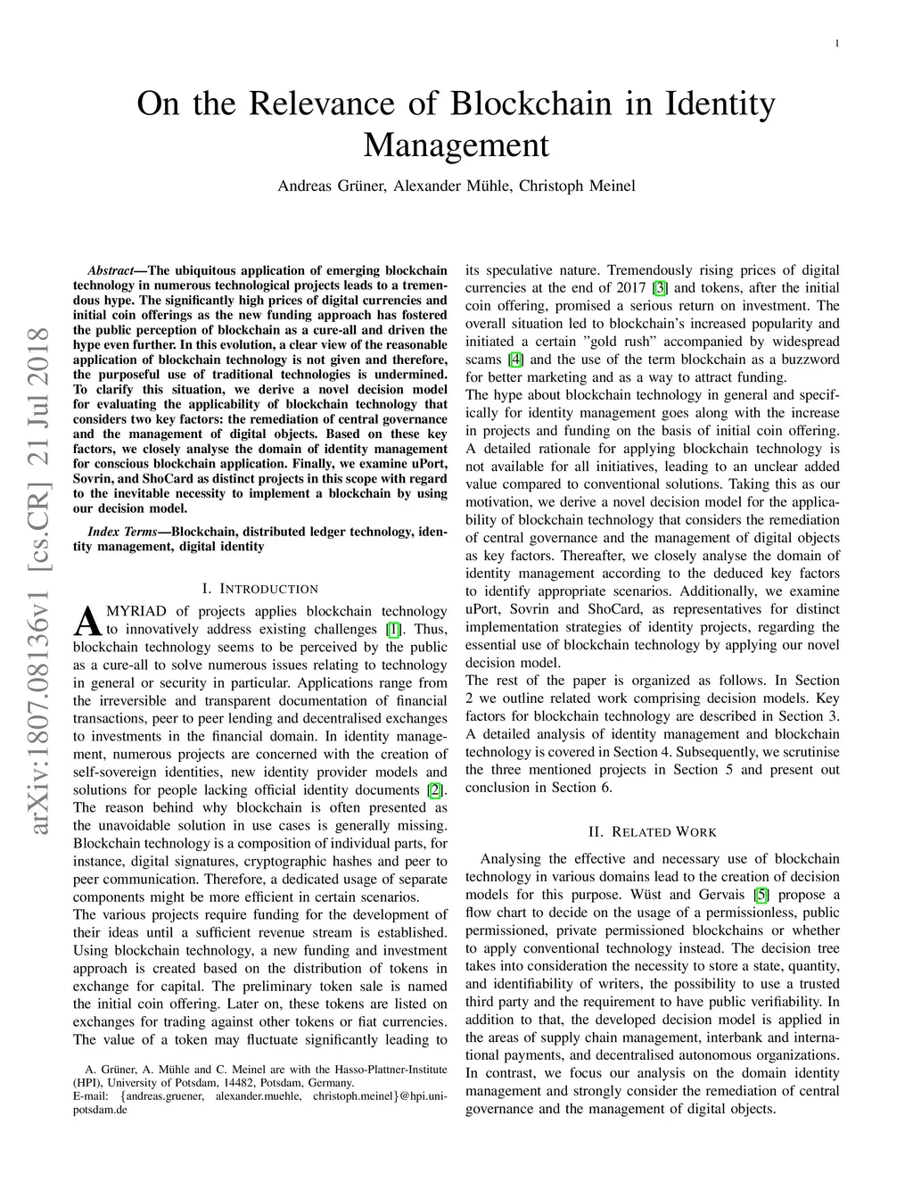 The ubiquitous application of emerging blockchain technology in numerous technological projects leads to a tremendous hype. The significantly high prices of digital currencies and initial coin offerings as the new funding approach has fostered the public perception of blockchain as a cure-all and driven the hype even further. In this evolution, a clear view of the reasonable application of blockchain technology is not given and therefore, the purposeful use of traditional technologies is undermined. To clarify this situation, we derive a novel decision model for evaluating the applicability of blockchain technology that considers two key factors: the remediation of central governance and the management of digital objects. Based on these key factors, we closely analyse the domain of identity management for conscious blockchain application. Finally, we examine uPort, Sovrin, and ShoCard as distinct projects in this scope with regard to the inevitable necessity to implement a blockchain by using our decision model.