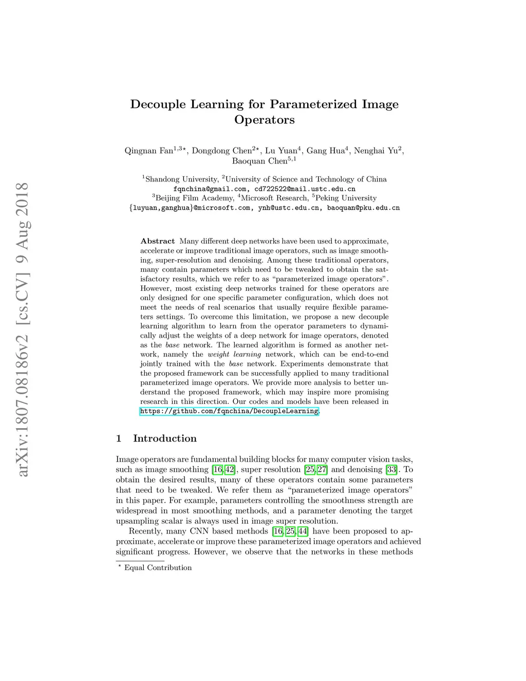 Many different deep networks have been used to approximate, accelerate or improve traditional image operators, such as image smoothing, super-resolution and denoising. Among these traditional operators, many contain parameters which need to be tweaked to obtain the satisfactory results, which we refer to as "parameterized image operators". However, most existing deep networks trained for these operators are only designed for one specific parameter configuration, which does not meet the needs of real scenarios that usually require flexible parameters settings. To overcome this limitation, we propose a new decouple learning algorithm to learn from the operator parameters to dynamically adjust the weights of a deep network for image operators, denoted as the base network. The learned algorithm is formed as another network, namely the weight learning network, which can be end-to-end jointly trained with the base network. Experiments demonstrate that the proposed framework can be successfully applied to many traditional parameterized image operators. We provide more analysis to better understand the proposed framework, which may inspire more promising research in this direction. Our codes and models have been released in https://github.com/fqnchina/DecoupleLearning