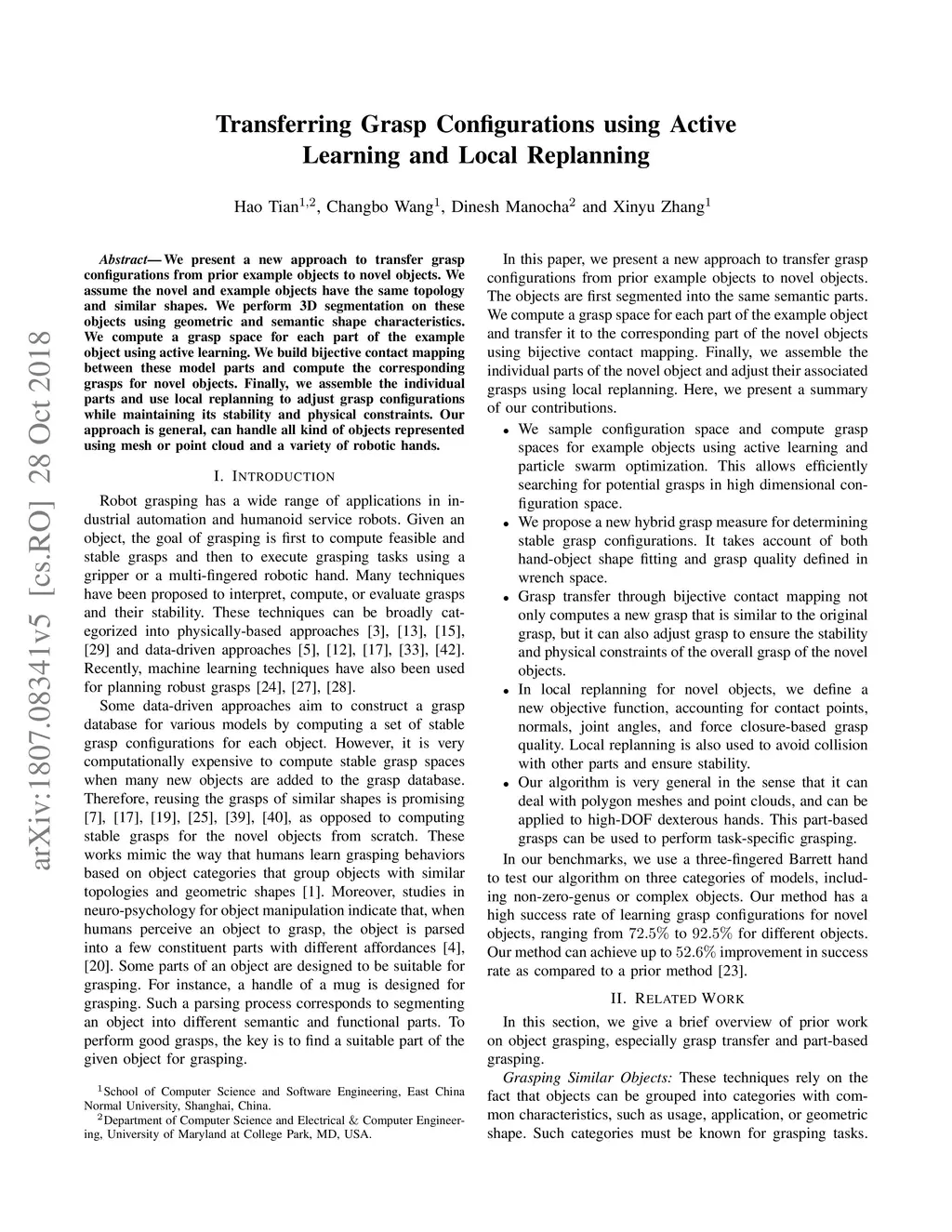 We present a new approach to transfer grasp configurations from prior example objects to novel objects. We assume the novel and example objects have the same topology and similar shapes. We perform 3D segmentation on these objects using geometric and semantic shape characteristics. We compute a grasp space for each part of the example object using active learning. We build bijective contact mapping between these model parts and compute the corresponding grasps for novel objects. Finally, we assemble the individual parts and use local replanning to adjust grasp configurations while maintaining its stability and physical constraints. Our approach is general, can handle all kind of objects represented using mesh or point cloud and a variety of robotic hands.