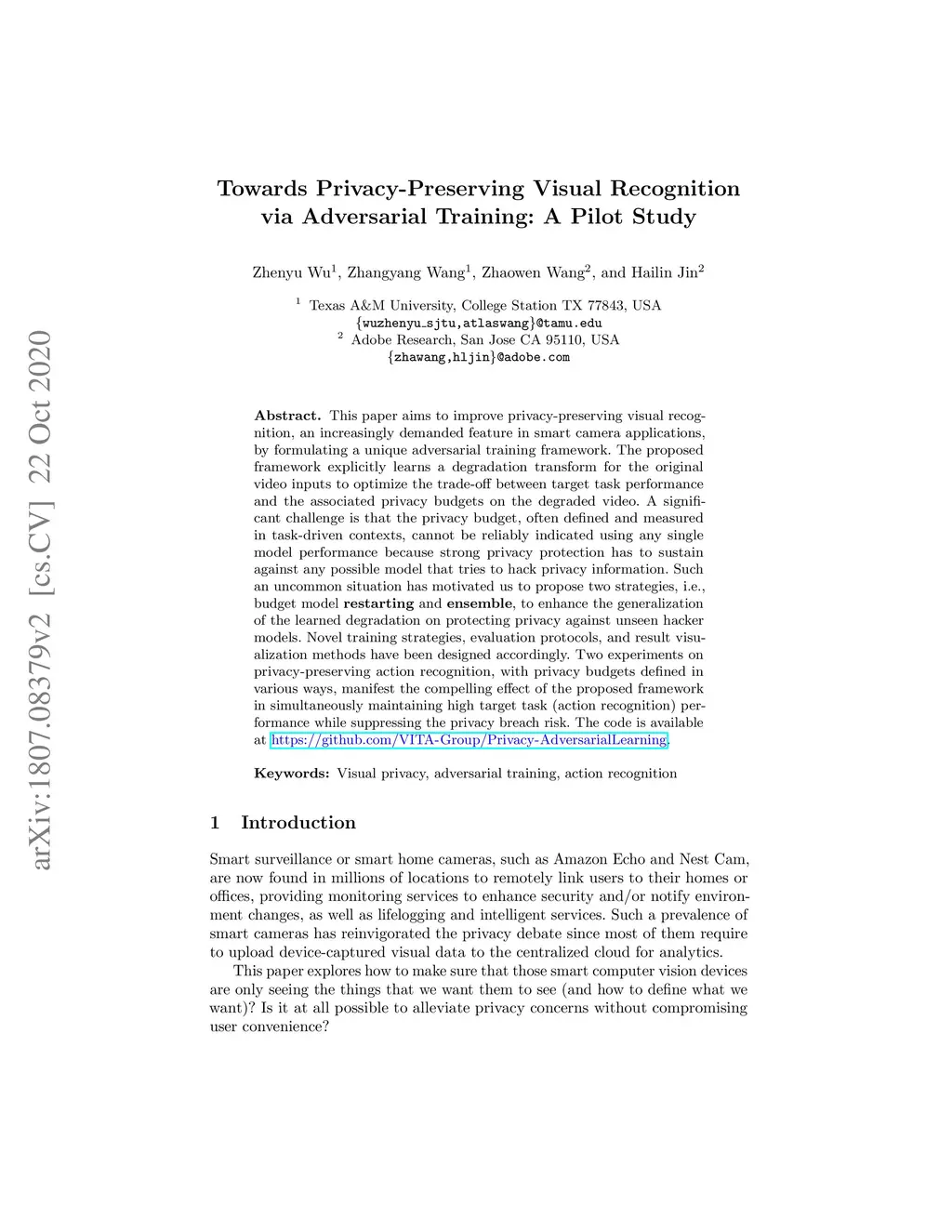 This paper aims to improve privacy-preserving visual recognition, an increasingly demanded feature in smart camera applications, by formulating a unique adversarial training framework. The proposed framework explicitly learns a degradation transform for the original video inputs, in order to optimize the trade-off between target task performance and the associated privacy budgets on the degraded video. A notable challenge is that the privacy budget, often defined and measured in task-driven contexts, cannot be reliably indicated using any single model performance, because a strong protection of privacy has to sustain against any possible model that tries to hack privacy information. Such an uncommon situation has motivated us to propose two strategies, i.e., budget model restarting and ensemble, to enhance the generalization of the learned degradation on protecting privacy against unseen hacker models. Novel training strategies, evaluation protocols, and result visualization methods have been designed accordingly. Two experiments on privacy-preserving action recognition, with privacy budgets defined in various ways, manifest the compelling effectiveness of the proposed framework in simultaneously maintaining high target task (action recognition) performance while suppressing the privacy breach risk.