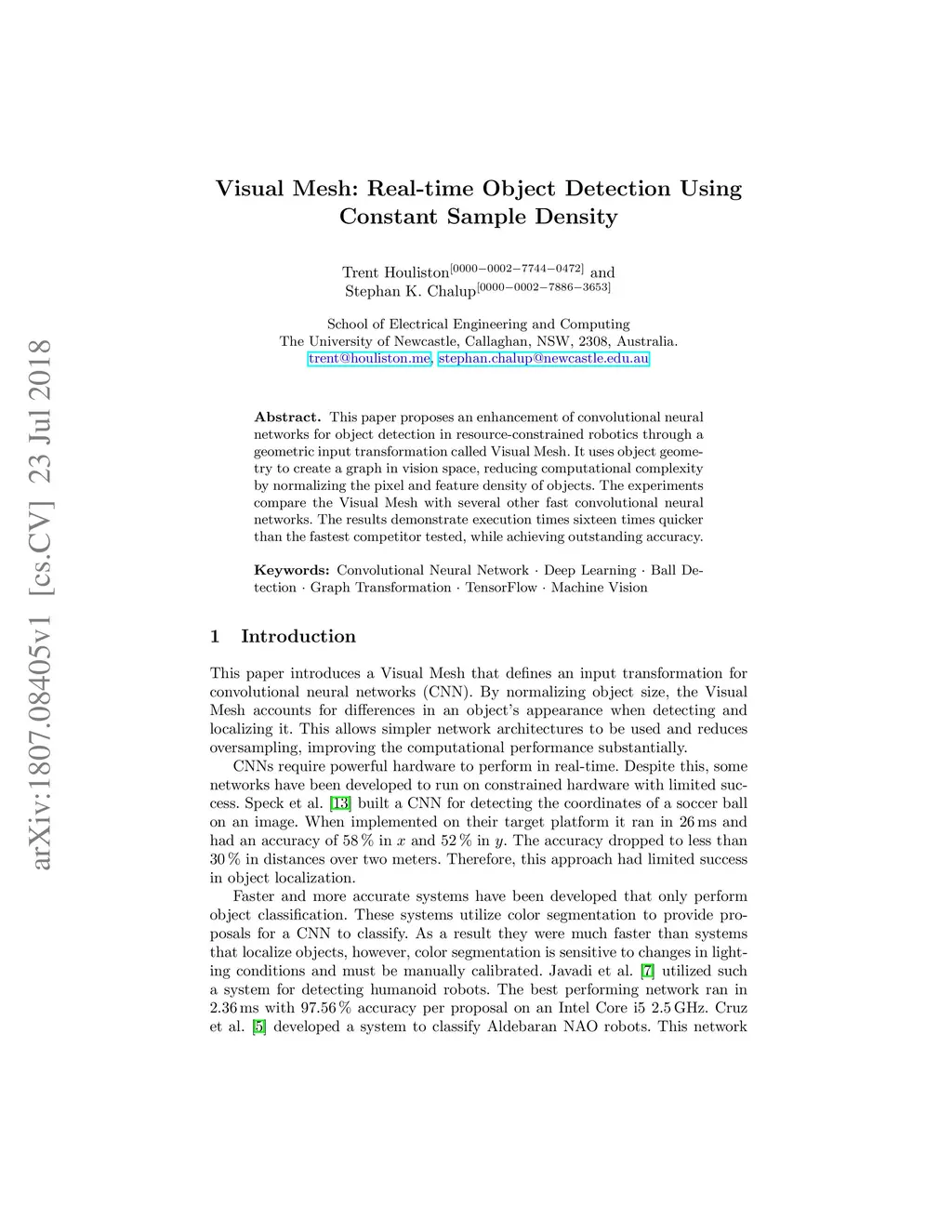 This paper proposes an enhancement of convolutional neural networks for object detection in resource-constrained robotics through a geometric input transformation called Visual Mesh. It uses object geometry to create a graph in vision space, reducing computational complexity by normalizing the pixel and feature density of objects. The experiments compare the Visual Mesh with several other fast convolutional neural networks. The results demonstrate execution times sixteen times quicker than the fastest competitor tested, while achieving outstanding accuracy.