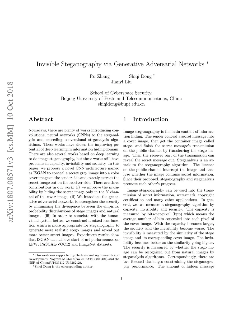 Steganography and steganalysis are main content of information hiding, they always make constant progress in confrontation. There is large consent that measures based on deep learning have outperformed conventional approaches in steganalysis, which have shown that deep learning is very promising for the information hiding area. And in the last two years, there are also several works using deep learning to achieve the procedure of steganography. While these works still have problems in capacity, invisibility and security. We proposed a new steganography model based on generative adversarial network named as ISGAN. Our model can conceal a secret gray image into a color cover image, and can reveal the secret image successfully. To improve the invisibility, we select a new concealing position and get excellent results. And with the help of GAN's adversarial training, our model can improve the security. In addition, we use a new loss function which is more appropriate to steganography, can boost the training speed and generate better stego images and revealed secret images. Experiment results show that ISGAN can achieve start-of-art performance on LFW, Pascal VOC2012 and ImageNet datasets.