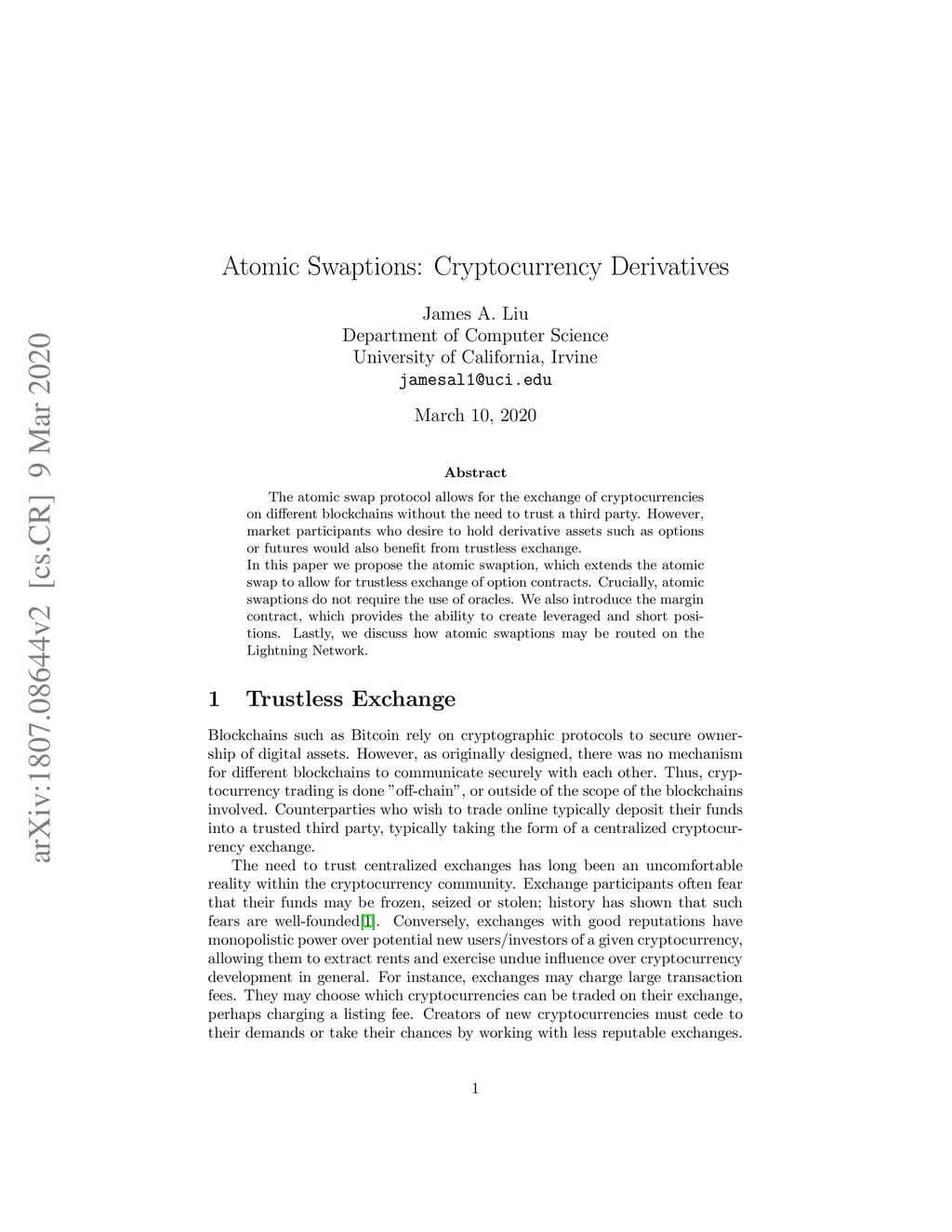 The atomic swap protocol allows for the exchange of cryptocurrencies on different blockchains without the need to trust a third-party. However, market participants who desire to hold derivative assets such as options or futures would also benefit from trustless exchange. In this paper I propose the atomic swaption, which extends the atomic swap to allow for such exchanges. Crucially, atomic swaptions do not require the use of oracles. I also introduce the margin contract, which provides the ability to create leveraged and short positions. Lastly, I discuss how atomic swaptions may be routed on the Lightning Network.