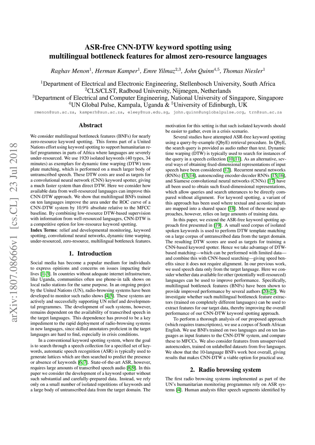 ASR-free CNN-DTW keyword spotting using multilingual bottleneck features
