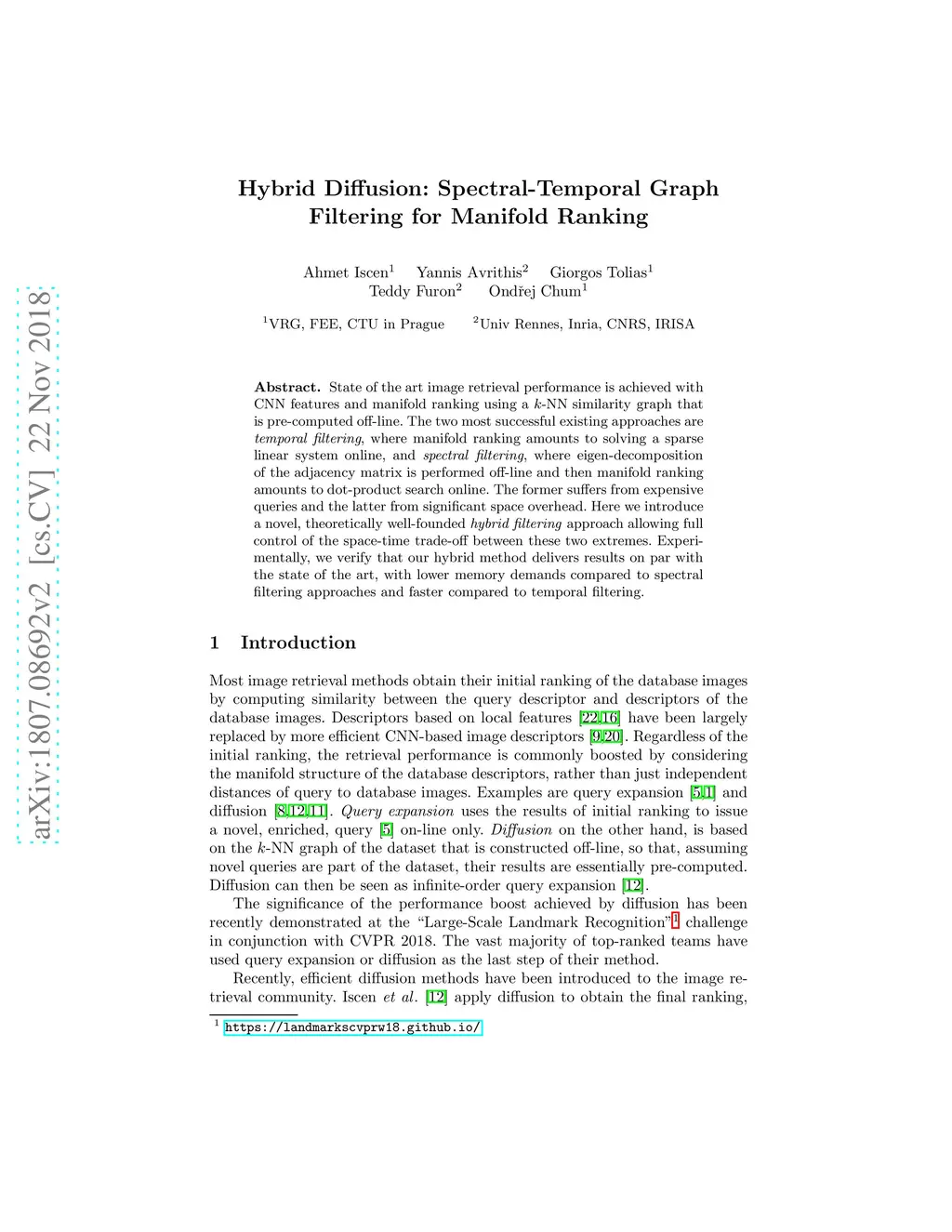 State of the art image retrieval performance is achieved with CNN features and manifold ranking using a k-NN similarity graph that is pre-computed off-line. The two most successful existing approaches are temporal filtering, where manifold ranking amounts to solving a sparse linear system online, and spectral filtering, where eigen-decomposition of the adjacency matrix is performed off-line and then manifold ranking amounts to dot-product search online. The former suffers from expensive queries and the latter from significant space overhead. Here we introduce a novel, theoretically well-founded hybrid filtering approach allowing full control of the space-time trade-off between these two extremes. Experimentally, we verify that our hybrid method delivers results on par with the state of the art, with lower memory demands compared to spectral filtering approaches and faster compared to temporal filtering.