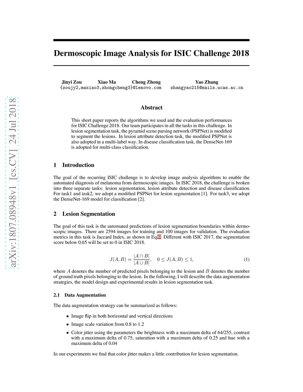 This short paper reports the algorithms we used and the evaluation performances for ISIC Challenge 2018. Our team participates in all the tasks in this challenge. In lesion segmentation task, the pyramid scene parsing network (PSPNet) is modified to segment the lesions. In lesion attribute detection task, the modified PSPNet is also adopted in a multi-label way. In disease classification task, the DenseNet-169 is adopted for multi-class classification.