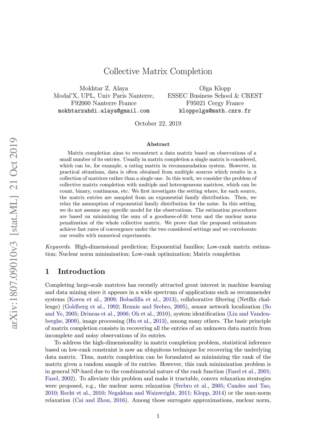 Matrix completion aims to reconstruct a data matrix based on observations of a small number of its entries. Usually in matrix completion a single matrix is considered, which can be, for example, a rating matrix in recommendation system. However, in practical situations, data is often obtained from multiple sources which results in a collection of matrices rather than a single one. In this work, we consider the problem of collective matrix completion with multiple and heterogeneous matrices, which can be count, binary, continuous, etc. We first investigate the setting where, for each source, the matrix entries are sampled from an exponential family distribution. Then, we relax the assumption of exponential family distribution for the noise and we investigate the distribution-free case. In this setting, we do not assume any specific model for the observations. The estimation procedures are based on minimizing the sum of a goodness-of-fit term and the nuclear norm penalization of the whole collective matrix. We prove that the proposed estimators achieve fast rates of convergence under the two considered settings and we corroborate our results with numerical experiments.