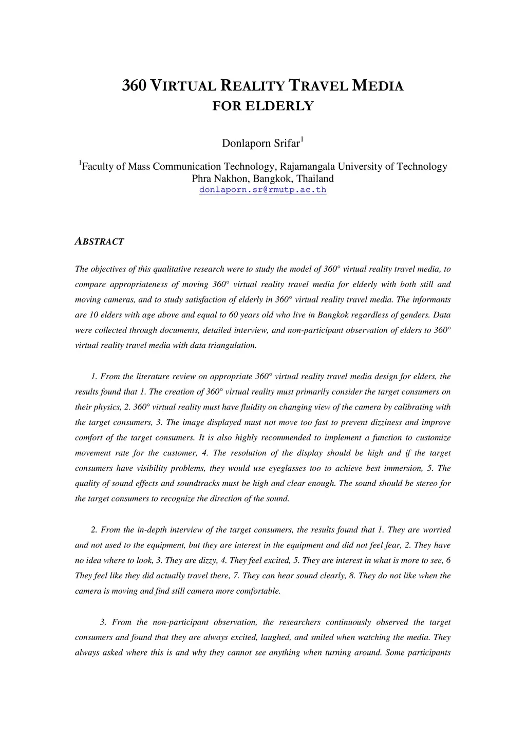 The objectives of this qualitative research were to study the model of 360-degree virtual reality travel media, to compare appropriateness of moving 360-degree virtual reality travel media for elderly with both still and moving cameras, and to study satisfaction of elderly in 360-degree virtual reality travel media. The informants are 10 elders with age above and equal to 60 years old who live in Bangkok regardless of genders. Data were collected through documents, detailed interview, and non-participant observation of elders to 360-degree virtual reality travel media with data triangulation. 1. From the literature review 1. The creation must primarily consider the target consumers on their physics 2. must have fluidity on changing the view of the camera by calibrating with the target consumers 3. The image displayed must not move too fast to prevent dizziness and improve the comfort of the target consumers. It is also highly recommended to implement a function to customize the movement rate for the customer. 2. From the in-depth interview with the target consumers, the results found that 1. They are worried and not used to the equipment 2. They have no idea where to look 3. They feel excited 5. They are interested in what is more to see 6. They feel like they did actually travel there 7. They can hear the sound clearly 8. They do not like when the camera is moving and find still camera more comfortable. 3. From the non-participant observation and found that they are always excited, laughed, and smiled when watching the media. They always asked where this is and why they cannot see anything when turning around.