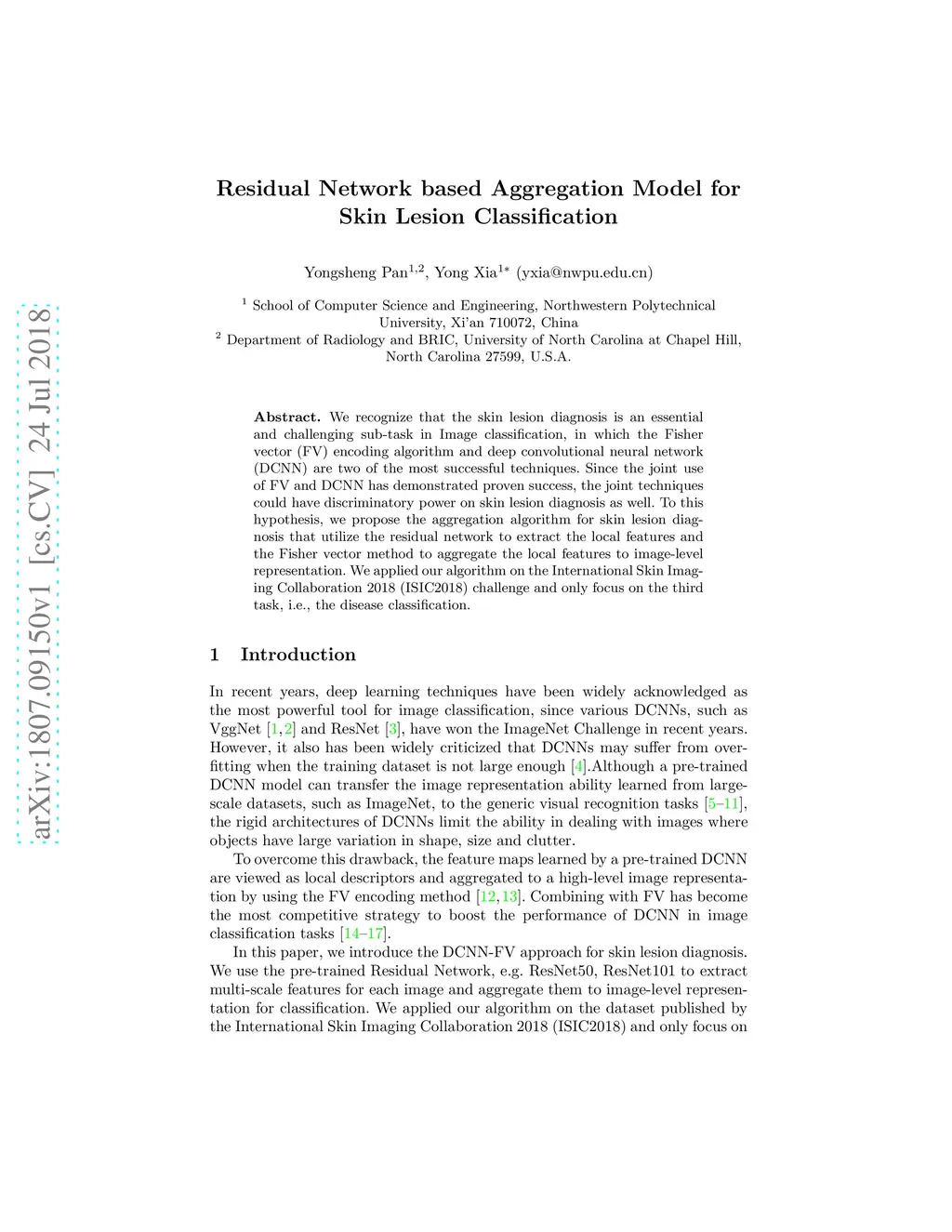 We recognize that the skin lesion diagnosis is an essential and challenging sub-task in Image classification, in which the Fisher vector (FV) encoding algorithm and deep convolutional neural network (DCNN) are two of the most successful techniques. Since the joint use of FV and DCNN has demonstrated proven success, the joint techniques could have discriminatory power on skin lesion diagnosis as well. To this hypothesis, we propose the aggregation algorithm for skin lesion diagnosis that utilize the residual network to extract the local features and the Fisher vector method to aggregate the local features to image-level representation. We applied our algorithm on the International Skin Imaging Collaboration 2018 (ISIC2018) challenge and only focus on the third task, i.e., the disease classification.