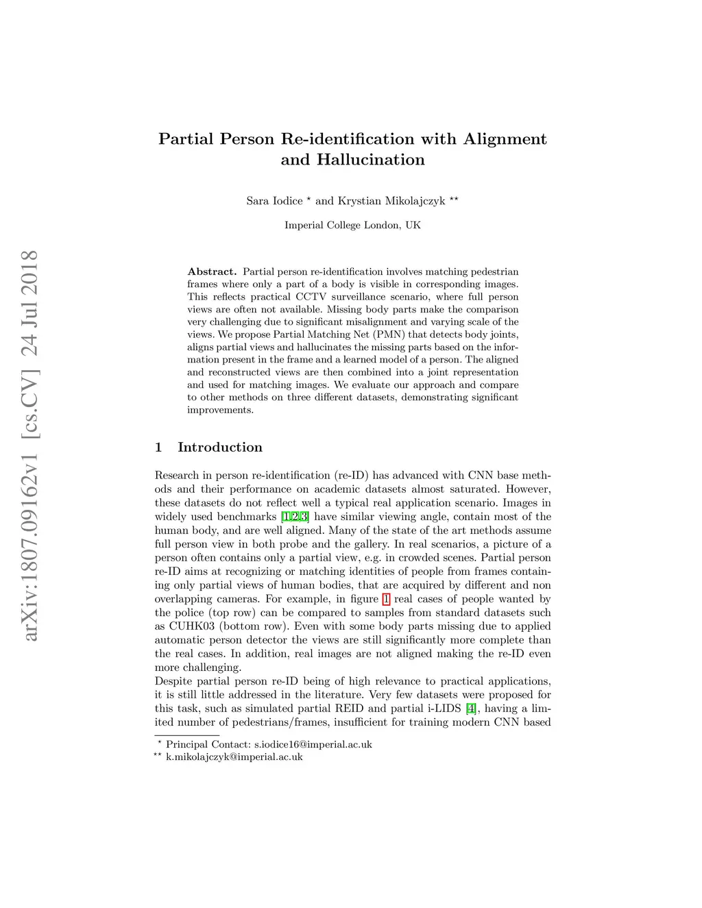 Partial person re-identification involves matching pedestrian frames where only a part of a body is visible in corresponding images. This reflects practical CCTV surveillance scenario, where full person views are often not available. Missing body parts make the comparison very challenging due to significant misalignment and varying scale of the views. We propose Partial Matching Net (PMN) that detects body joints, aligns partial views and hallucinates the missing parts based on the information present in the frame and a learned model of a person. The aligned and reconstructed views are then combined into a joint representation and used for matching images. We evaluate our approach and compare to other methods on three different datasets, demonstrating significant improvements.