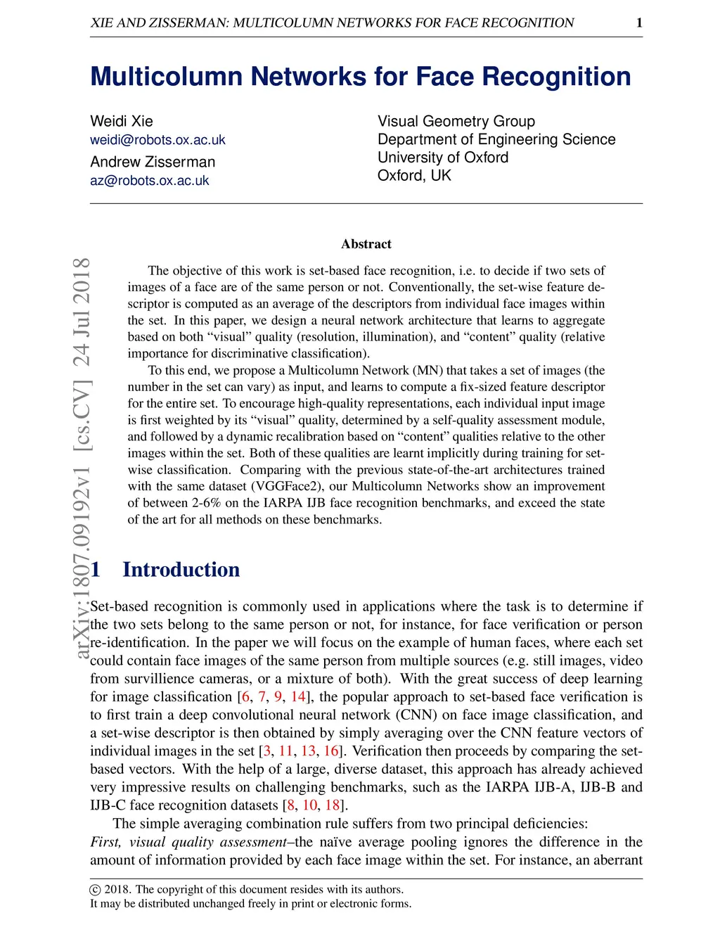 The objective of this work is set-based face recognition, i.e. to decide if two sets of images of a face are of the same person or not. Conventionally, the set-wise feature descriptor is computed as an average of the descriptors from individual face images within the set. In this paper, we design a neural network architecture that learns to aggregate based on both "visual" quality (resolution, illumination), and "content" quality (relative importance for discriminative classification). To this end, we propose a Multicolumn Network (MN) that takes a set of images (the number in the set can vary) as input, and learns to compute a fix-sized feature descriptor for the entire set. To encourage high-quality representations, each individual input image is first weighted by its "visual" quality, determined by a self-quality assessment module, and followed by a dynamic recalibration based on "content" qualities relative to the other images within the set. Both of these qualities are learnt implicitly during training for set-wise classification. Comparing with the previous state-of-the-art architectures trained with the same dataset (VGGFace2), our Multicolumn Networks show an improvement of between 2-6% on the IARPA IJB face recognition benchmarks, and exceed the state of the art for all methods on these benchmarks.