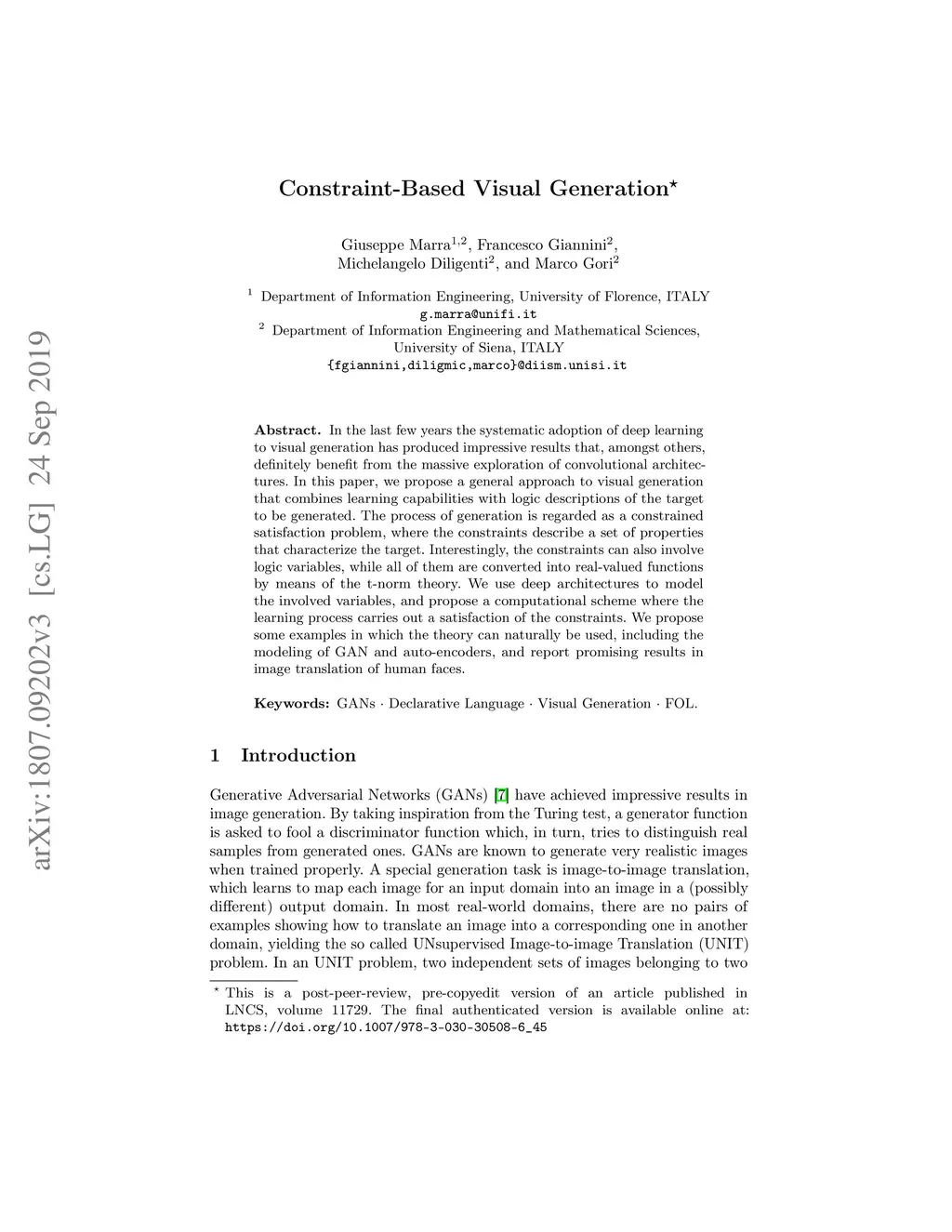 In the last few years the systematic adoption of deep learning to visual generation has produced impressive results that, amongst others, definitely benefit from the massive exploration of convolutional architectures. In this paper, we propose a general approach to visual generation that combines learning capabilities with logic descriptions of the target to be generated. The process of generation is regarded as a constrained satisfaction problem, where the constraints describe a set of properties that characterize the target. Interestingly, the constraints can also involve logic variables, while all of them are converted into real-valued functions by means of the t-norm theory. We use deep architectures to model the involved variables, and propose a computational scheme where the learning process carries out a satisfaction of the constraints. We propose some examples in which the theory can naturally be used, including the modeling of GAN and auto-encoders, and report promising results in problems with the generation of handwritten characters and face transformations.