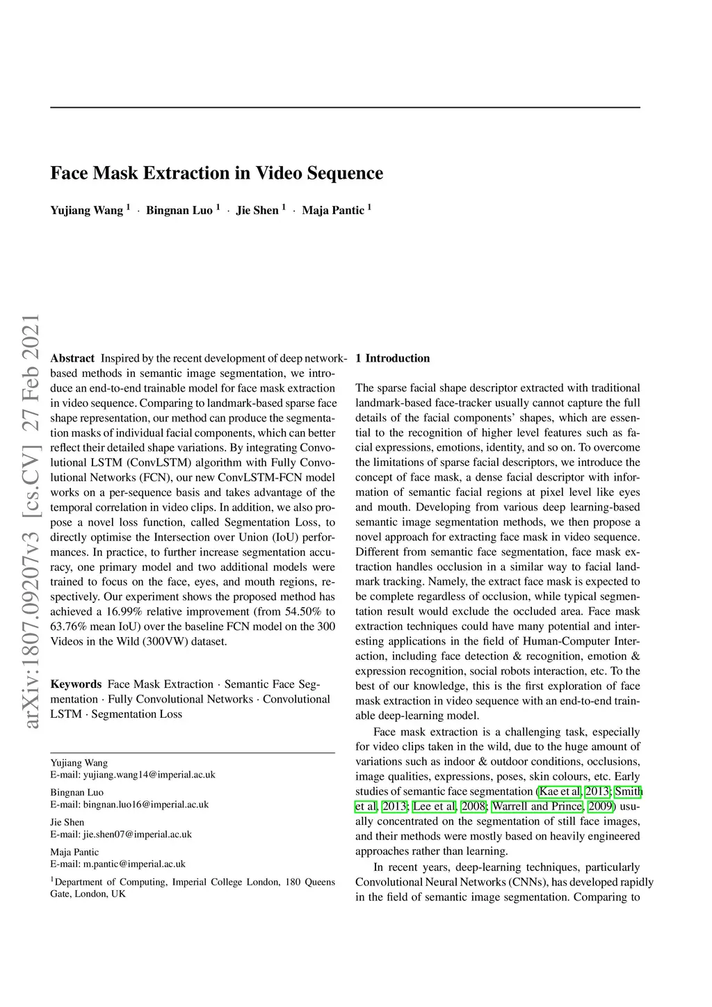 Inspired by the recent development of deep network-based methods in semantic image segmentation, we introduce an end-to-end trainable model for face mask extraction in video sequence. Comparing to landmark-based sparse face shape representation, our method can produce the segmentation masks of individual facial components, which can better reflect their detailed shape variations. By integrating Convolutional LSTM (ConvLSTM) algorithm with Fully Convolutional Networks (FCN), our new ConvLSTM-FCN model works on a per-sequence basis and takes advantage of the temporal correlation in video clips. In addition, we also propose a novel loss function, called Segmentation Loss, to directly optimise the Intersection over Union (IoU) performances. In practice, to further increase segmentation accuracy, one primary model and two additional models were trained to focus on the face, eyes, and mouth regions, respectively. Our experiment shows the proposed method has achieved a 16.99% relative improvement (from 54.50% to 63.76% mean IoU) over the baseline FCN model on the 300 Videos in the Wild (300VW) dataset.