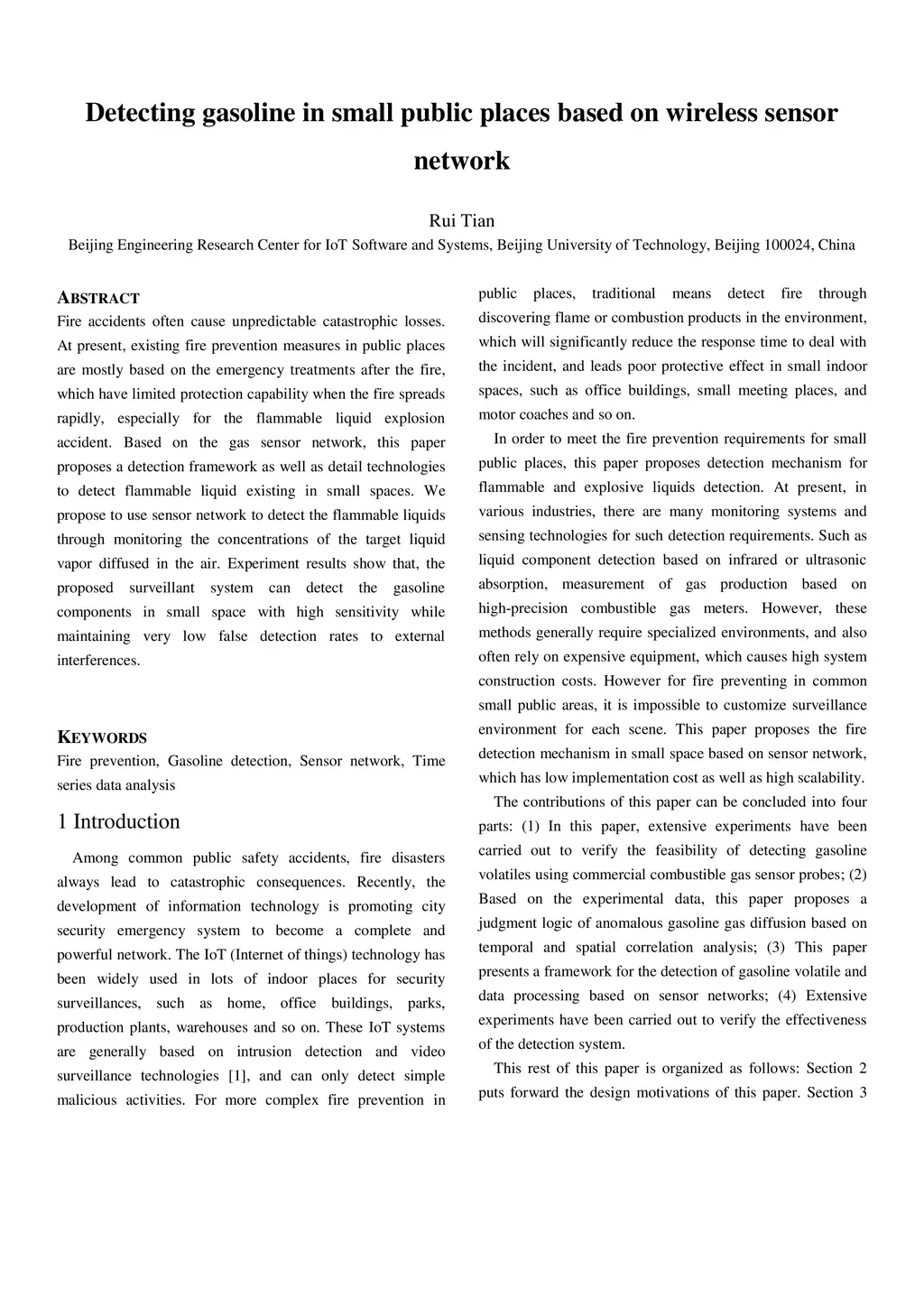 Fire accidents often cause unpredictable catastrophic losses. At present, existing fire prevention measures in public places are mostly based on the emergency treatments after the fire, which have limited protection capability when the fire spreads rapidly, especially for the flammable liquid explosion accident. Based on the gas sensor network, this paper proposes a detection framework as well as detail technologies to detect flammable liquid existing in small spaces. We propose to use sensor network to detect the flammable liquids through monitoring the concentrations of the target liquid vapor diffused in the air. Experiment results show that, the proposed surveillant system can detect the gasoline components in small space with high sensitivity while maintaining very low false detection rates to external interferences.